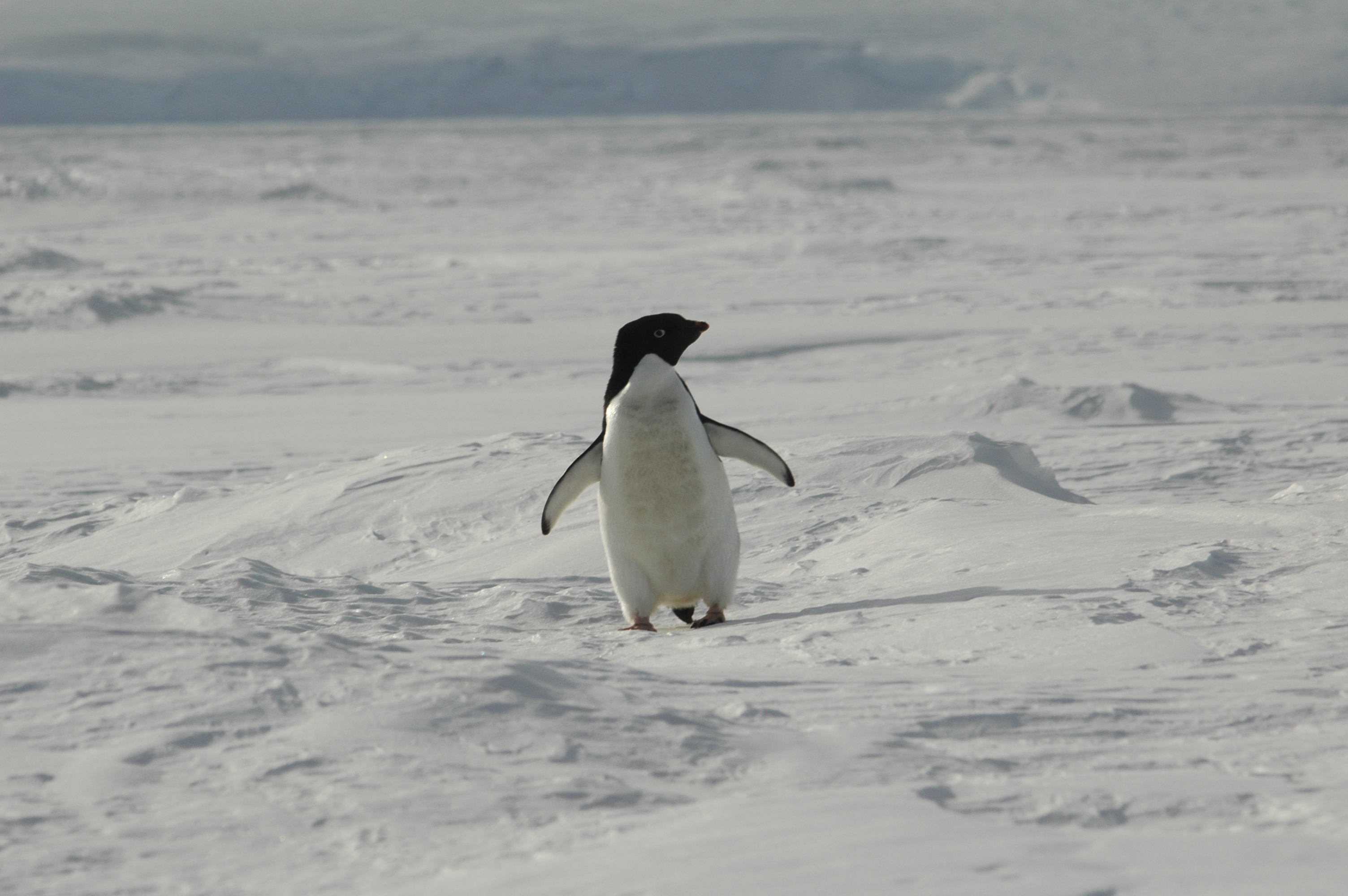 An Adélie penguin wanders on the sea ice. McMurdo Station, Antarctica.