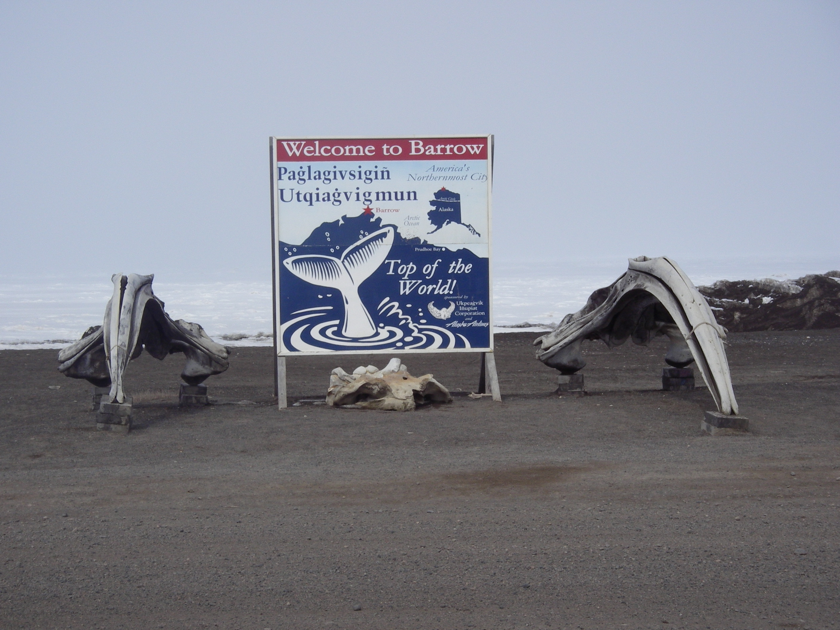 This photo shows the Welcome to the Top of the World sign indicating that Barrow is the furthest point north in the United States. The skulls of two bowhead whales are on either side.