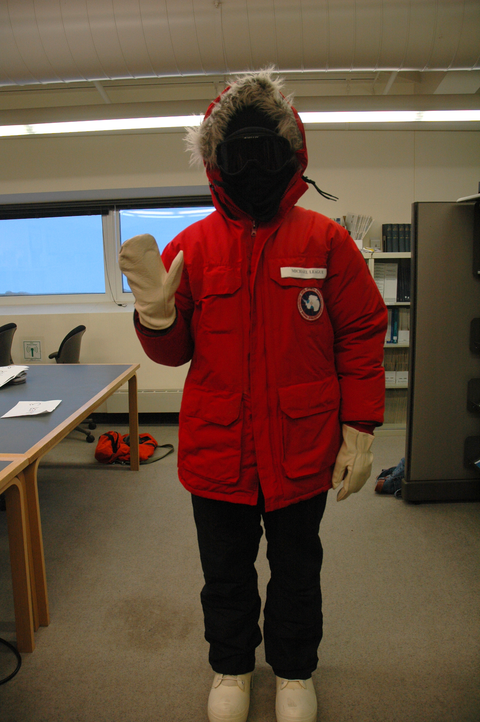 Extreme Cold Weather gear layer five: Face mask, hood up, and gloves. Christchurch, New Zealand.