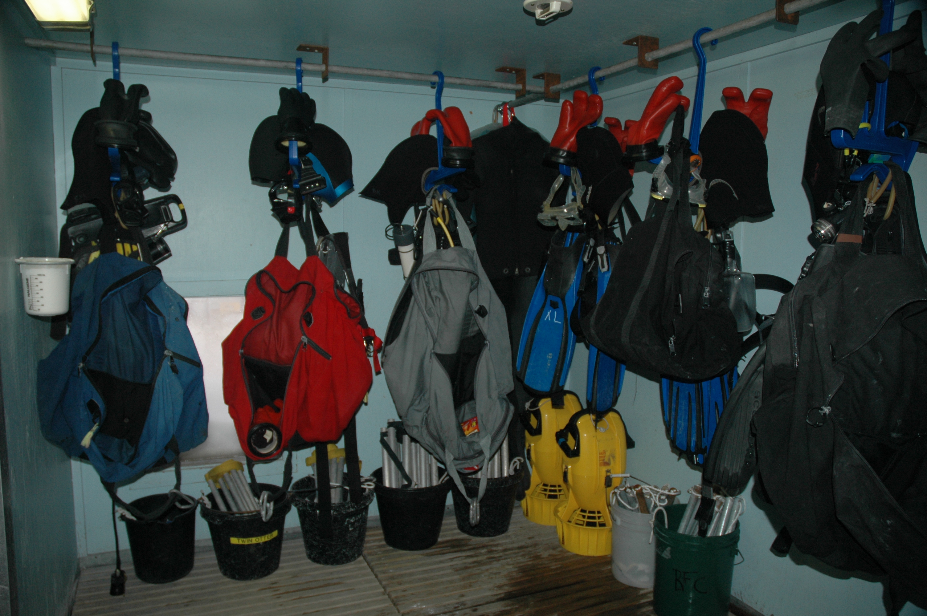 This is wear dive gear is rinsed and hung to dry. Each diver has a hanger for their gear. McMurdo Station, Antarctica.