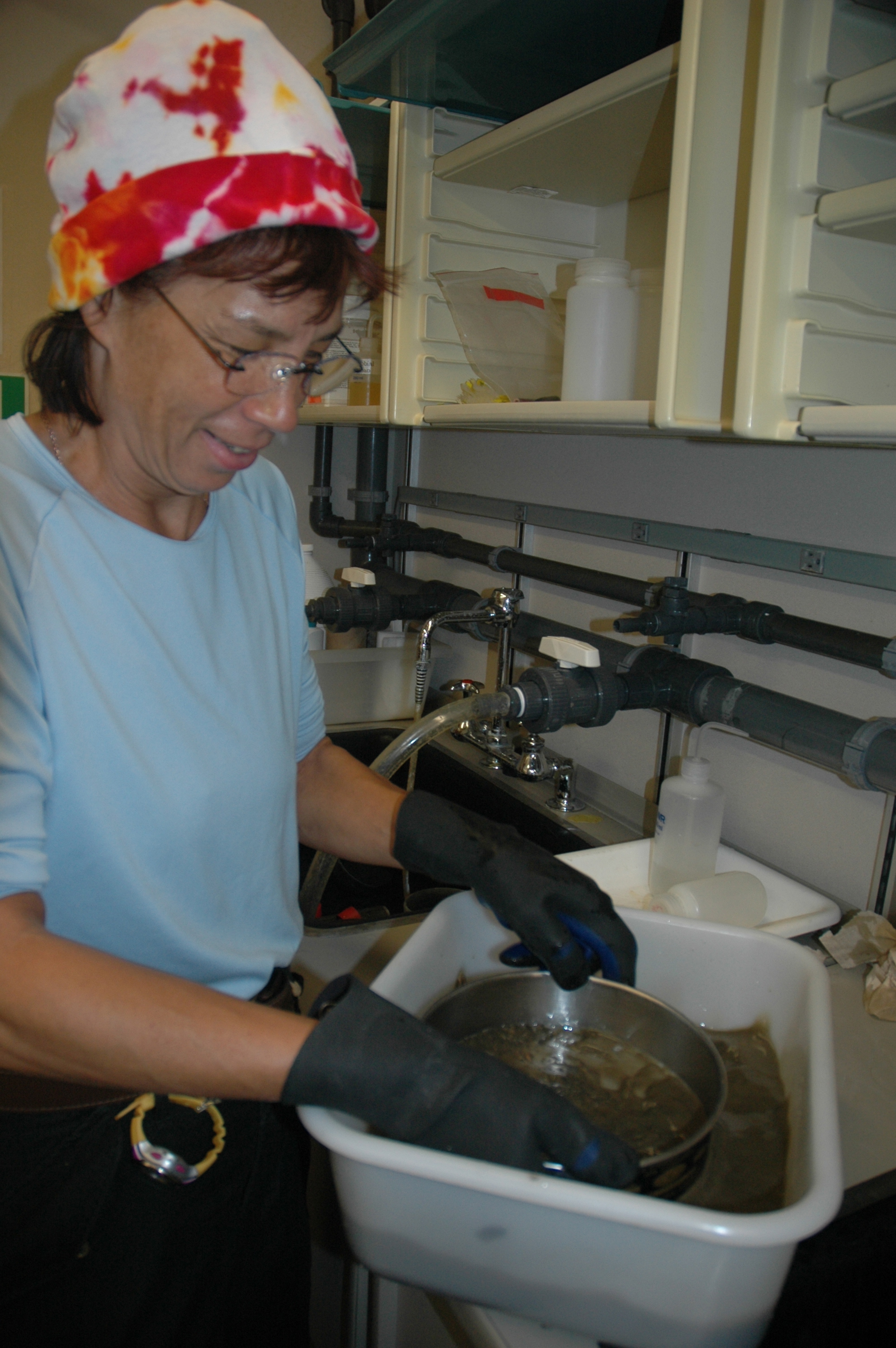 Dr. Stacy Kim sieves each of the cores. McMurdo Station, Antarctica.