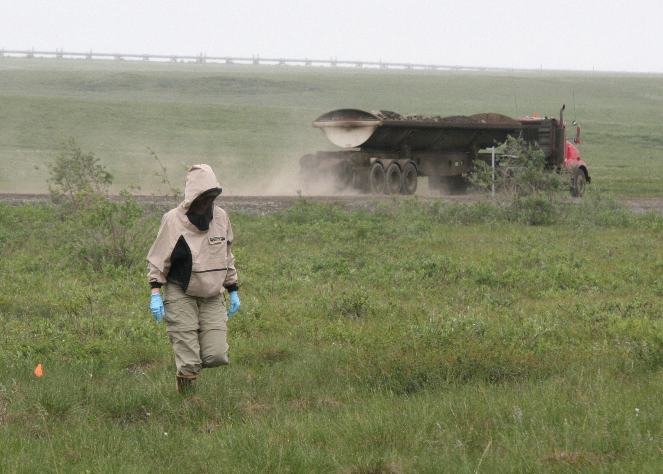 Fellow PolarTREC teacher Nell Kemp does field work along the Dalton Highway, Alaska.