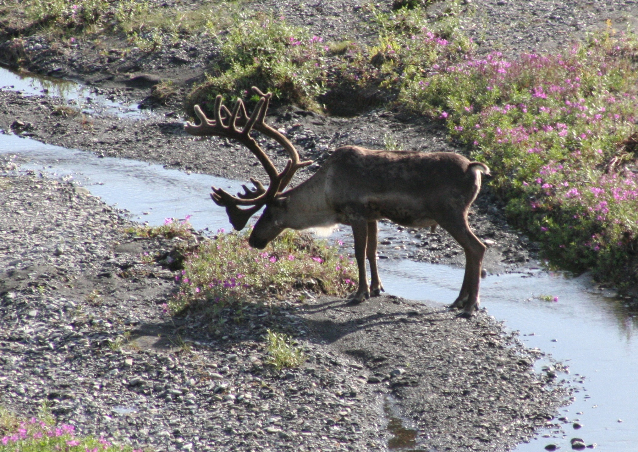 A caribou in a stream in Denali National Park and Preserve, Alaska.