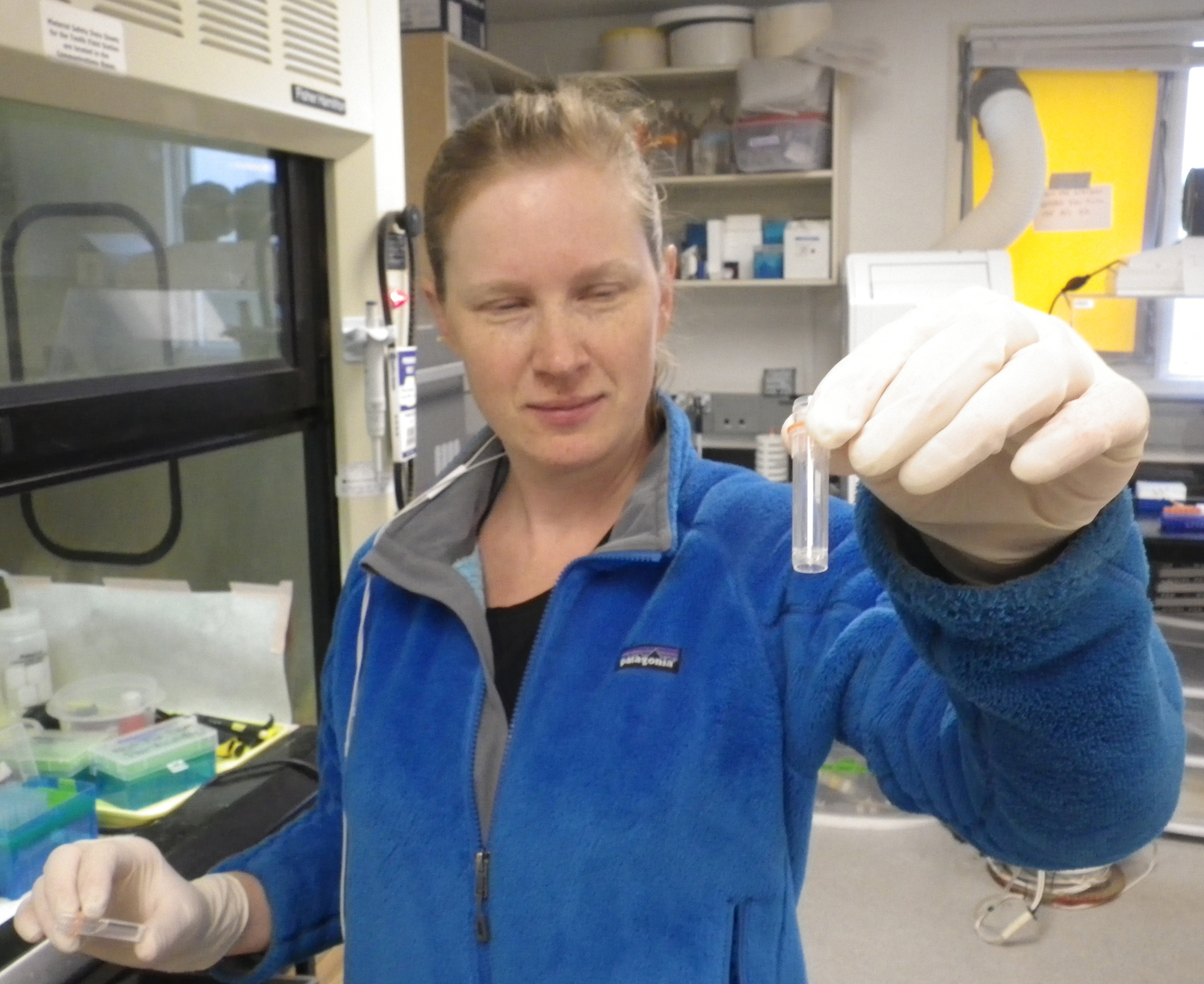 Michelle Stuart with a centrifuged vial containing a pellet of DNA material. Toolik Field Station, Alaska.