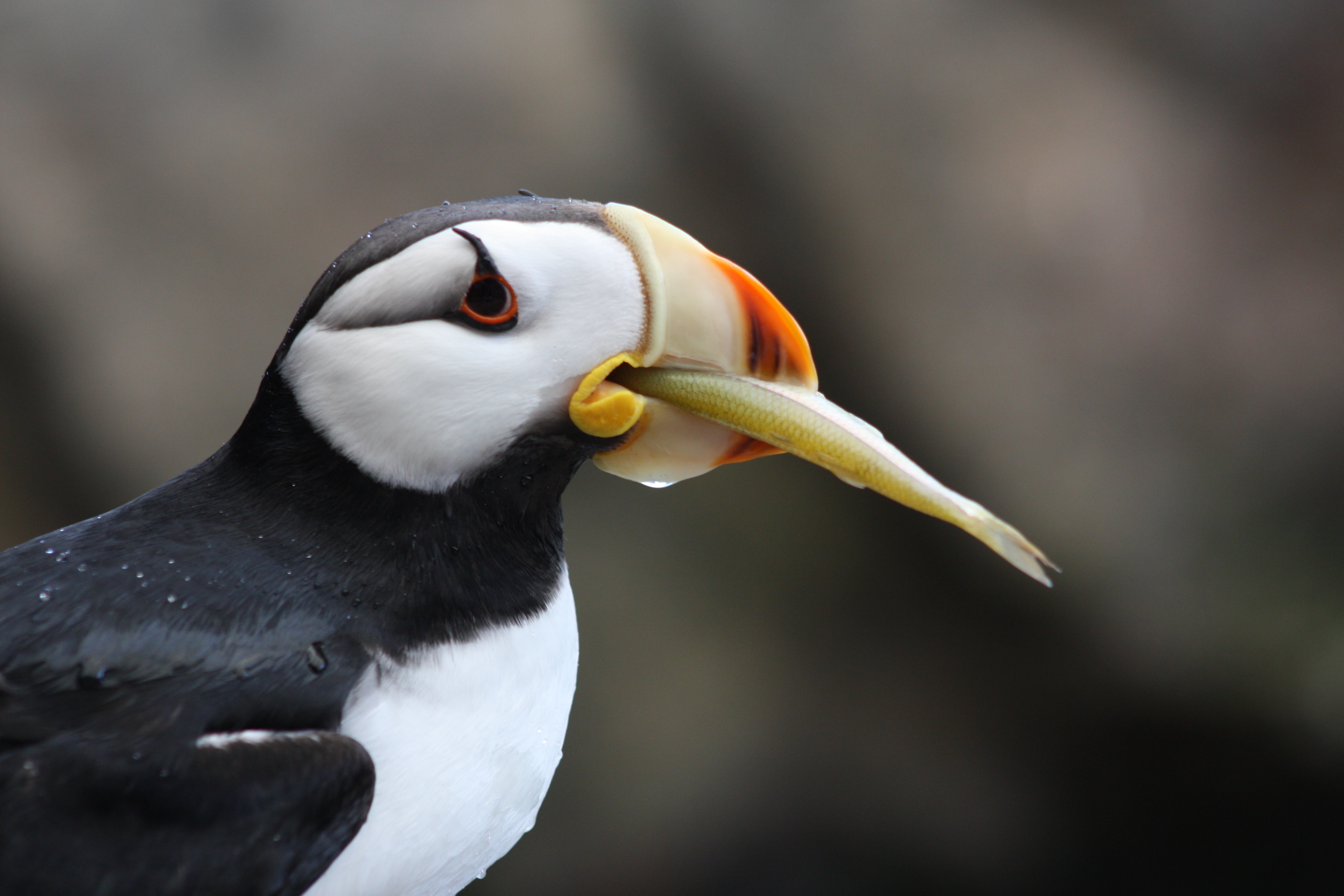 Jim Miller: "This puffin was pretty hungry! He ended up holding 4-5 fish in his beak before he flew away." At the Alaska SeaLife Center in Seward, Alaska.
