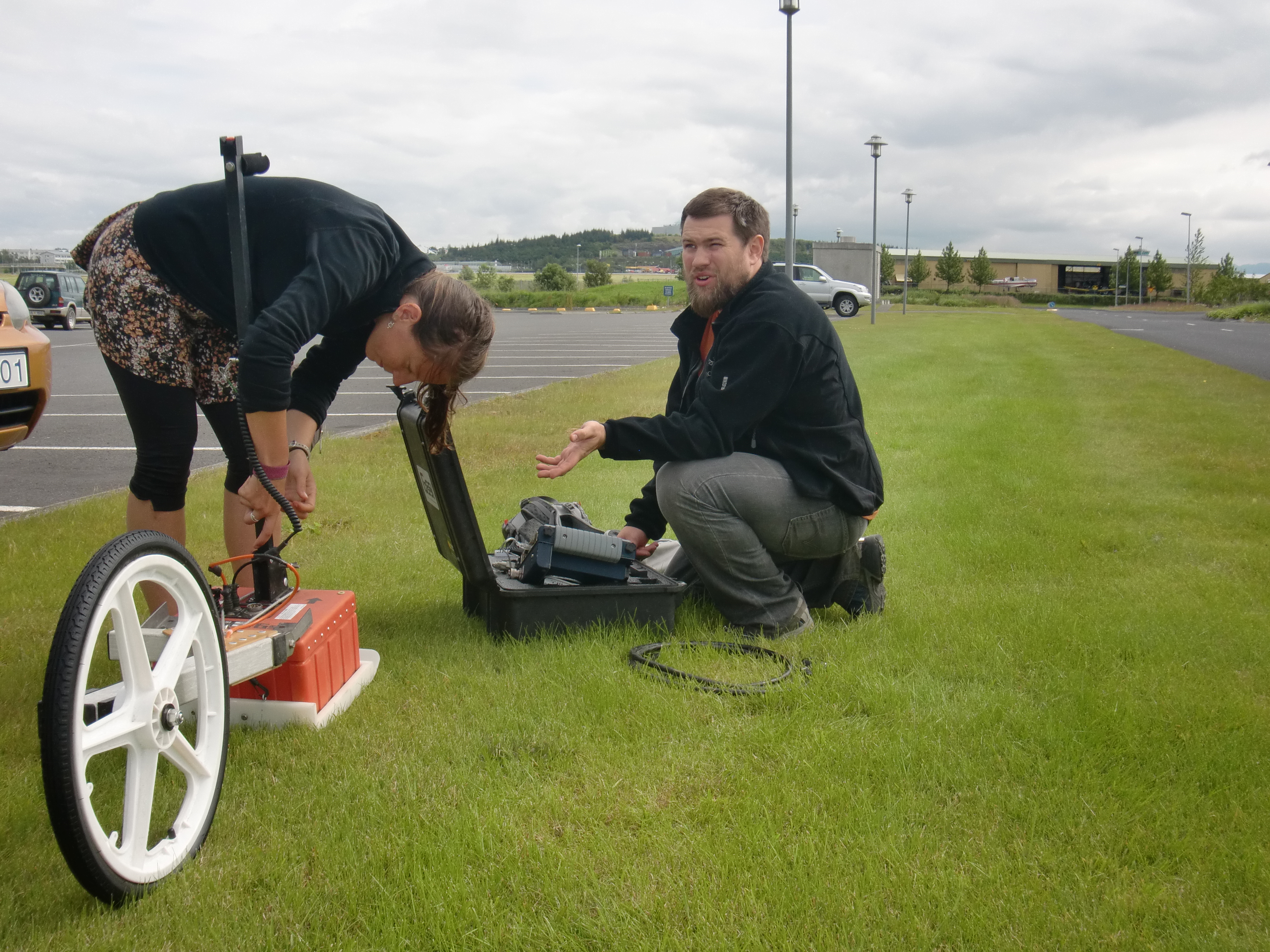 Luke Zoet and Reba McCracken begin assembling and testing out the Ground-Penetrating Radar (GPR) device that the team will bring along to Múlajökul. Reykjavík, Iceland.