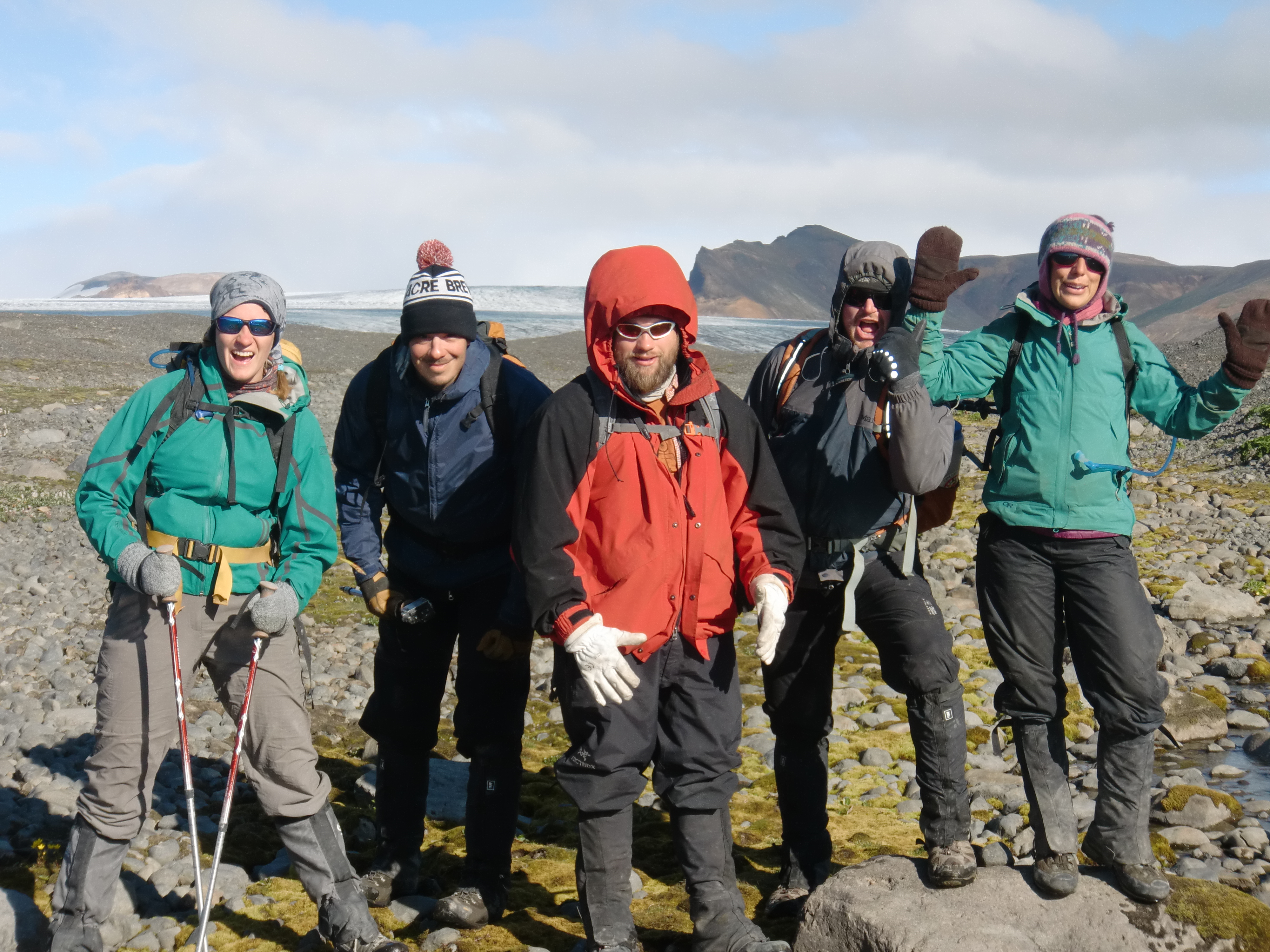 Jamie Esler: "The team rejoices about sun and warmer temperatures as we head in to the field." At Múlajökul glacier in Central Iceland.