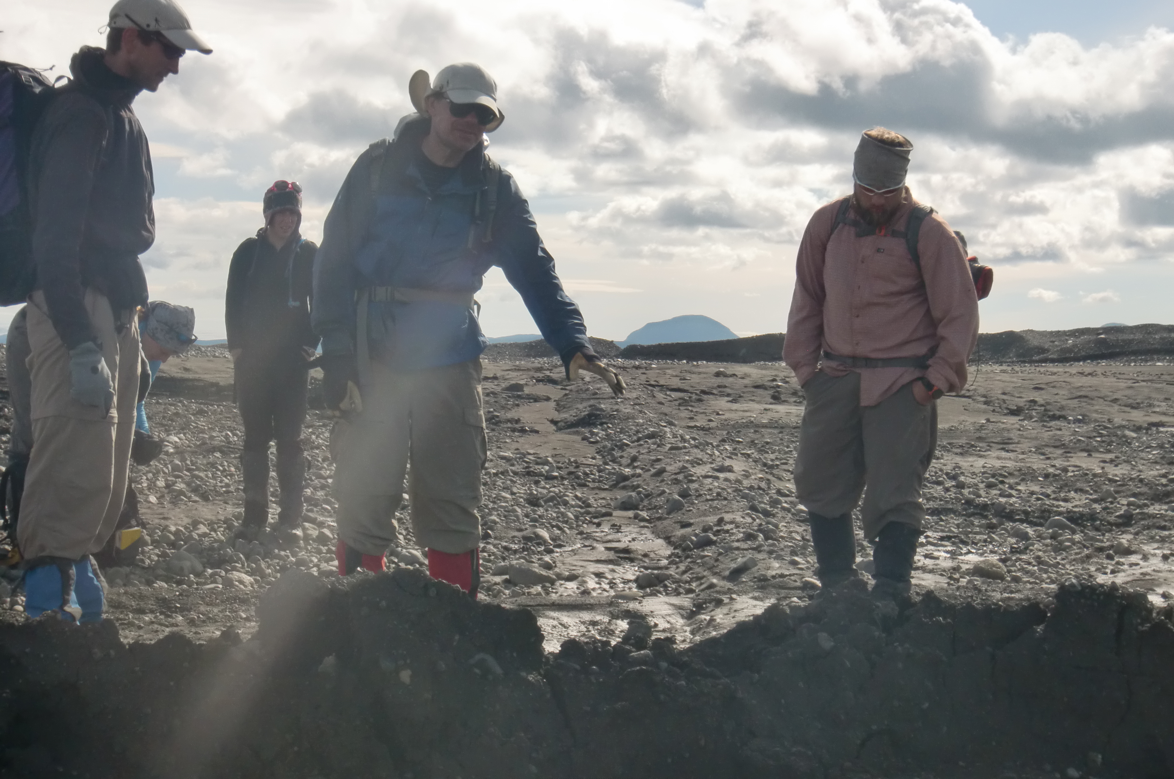 Dr. Neal Iverson points out a flute running perpendicular to the direction of ice flow. The flute is the long, low, thin line of till between Neal Iverson and Luke Zoet on the ground, running towards the top center of the photo. At Múlajökul glacier in Central Iceland.