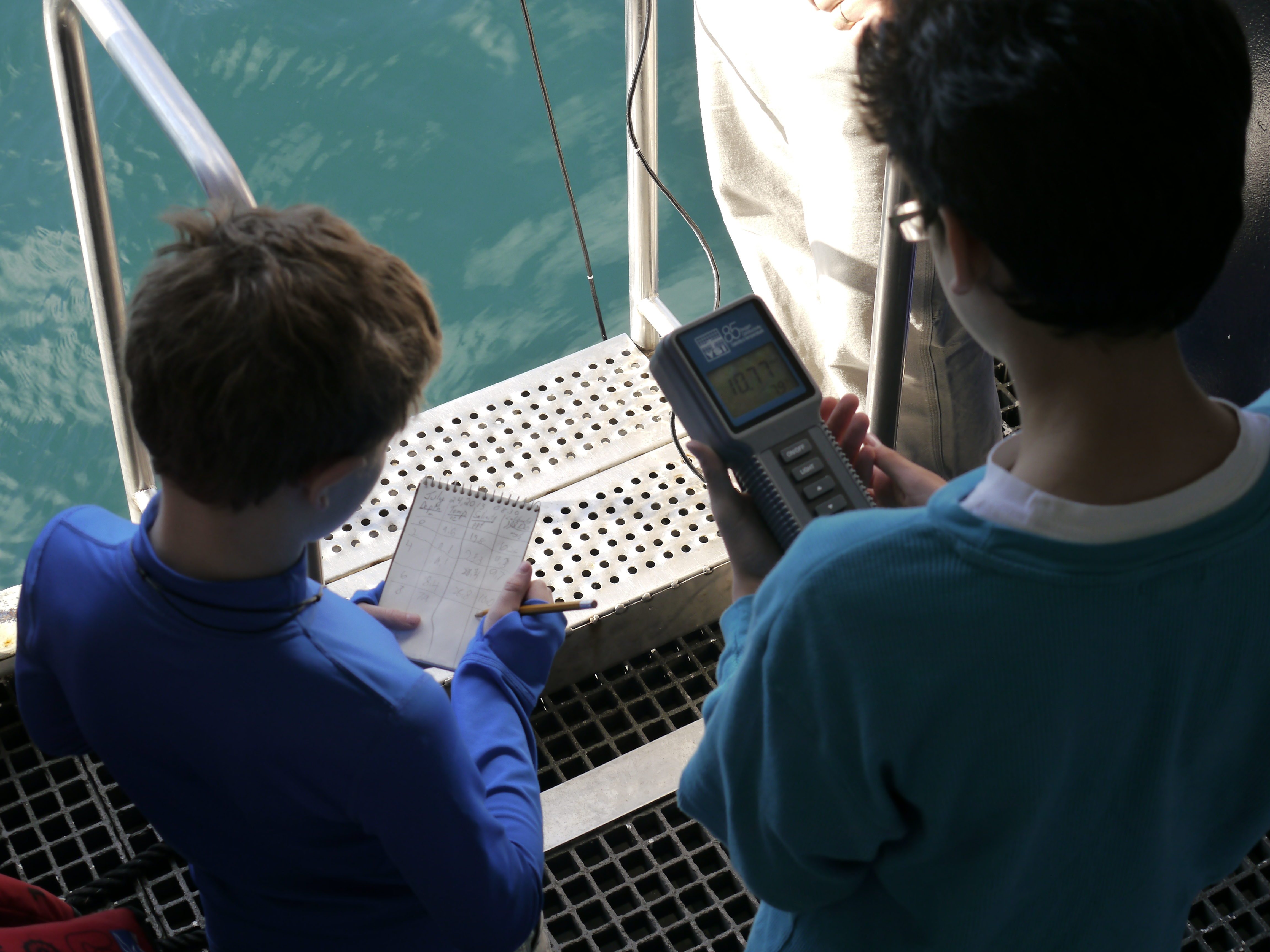Two young guests aboard the National Geographic Explorer measure temperature and salinity vs. depth in SW Greenland. Aboard the National Geographic Explorer during the Along the Viking Trail expedition, which Bill Schmoker participated in as a Grosvenor Teacher Fellow.