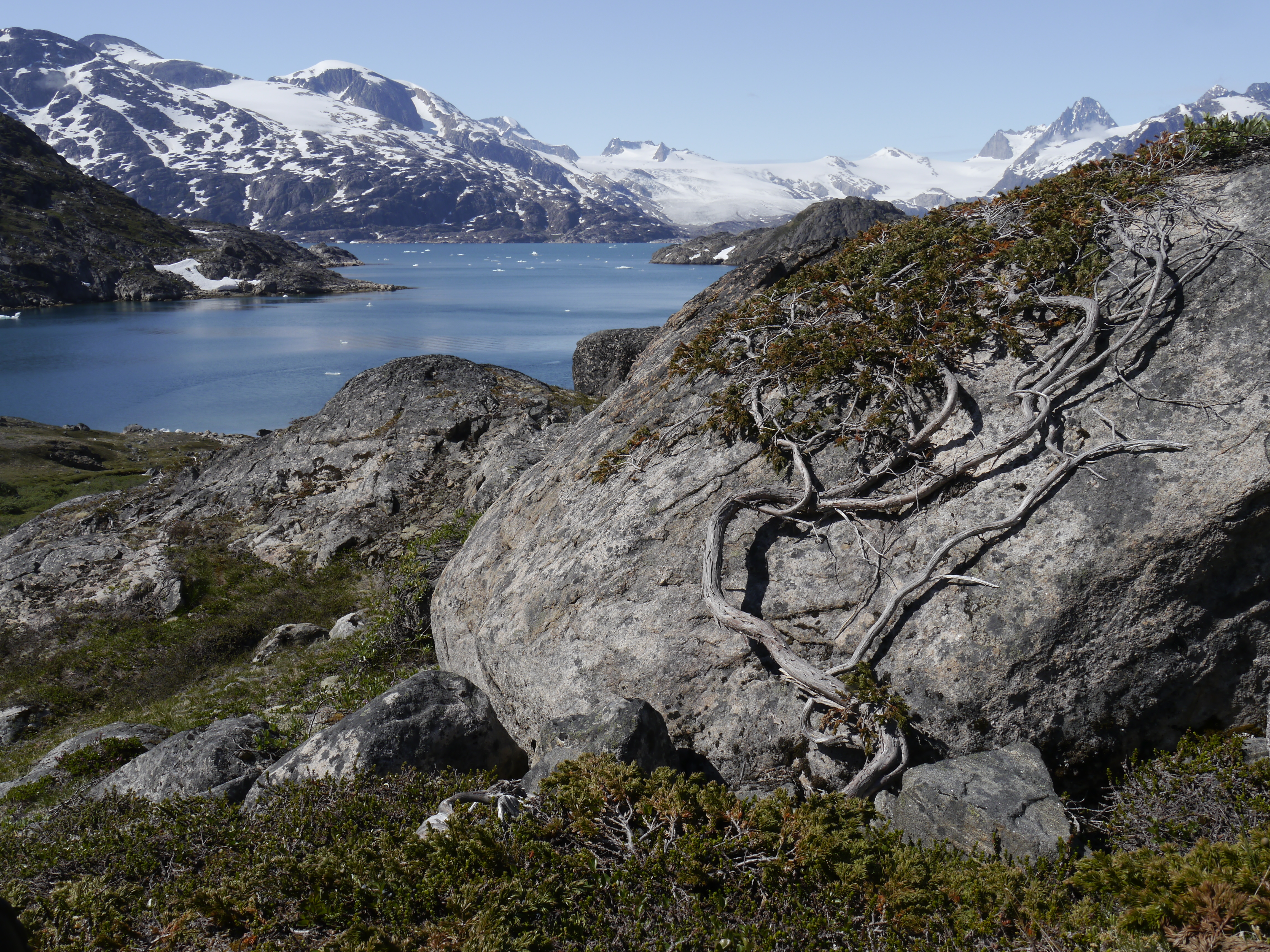 A dwarf juniper clings to a boulder above Skjoldungesund, Southeast Greenland. During the Along the Viking Trail expedition, which Bill Schmoker participated in as a Grosvenor Teacher Fellow.