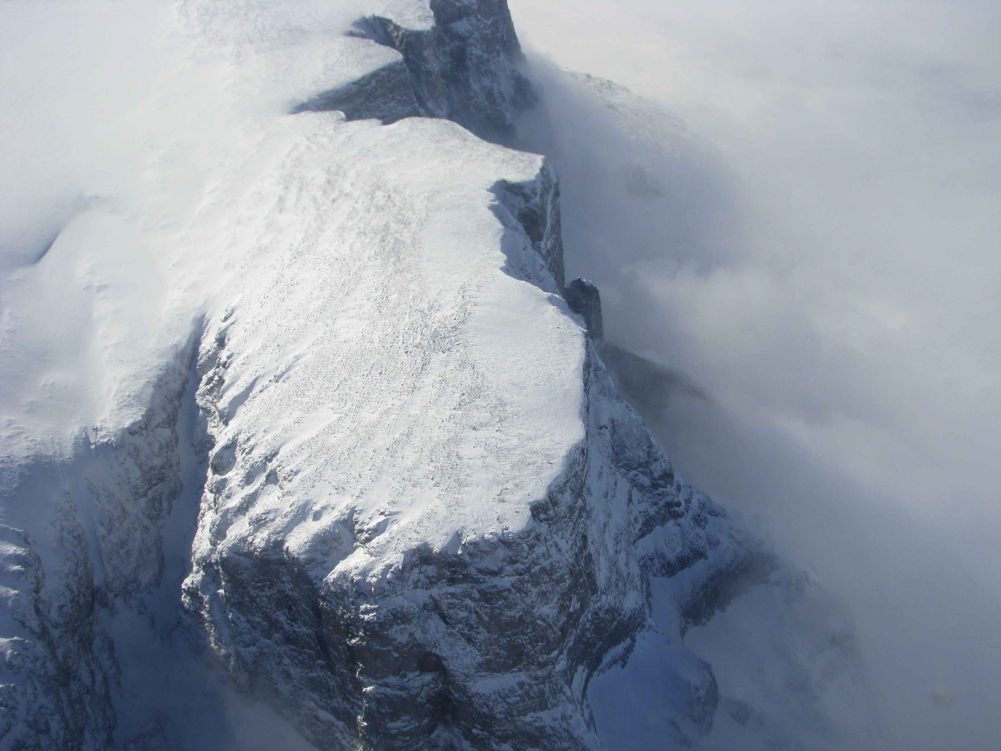 The cliff edge of a plateau. Aboard the P-3 Orion, flying over Greenland.