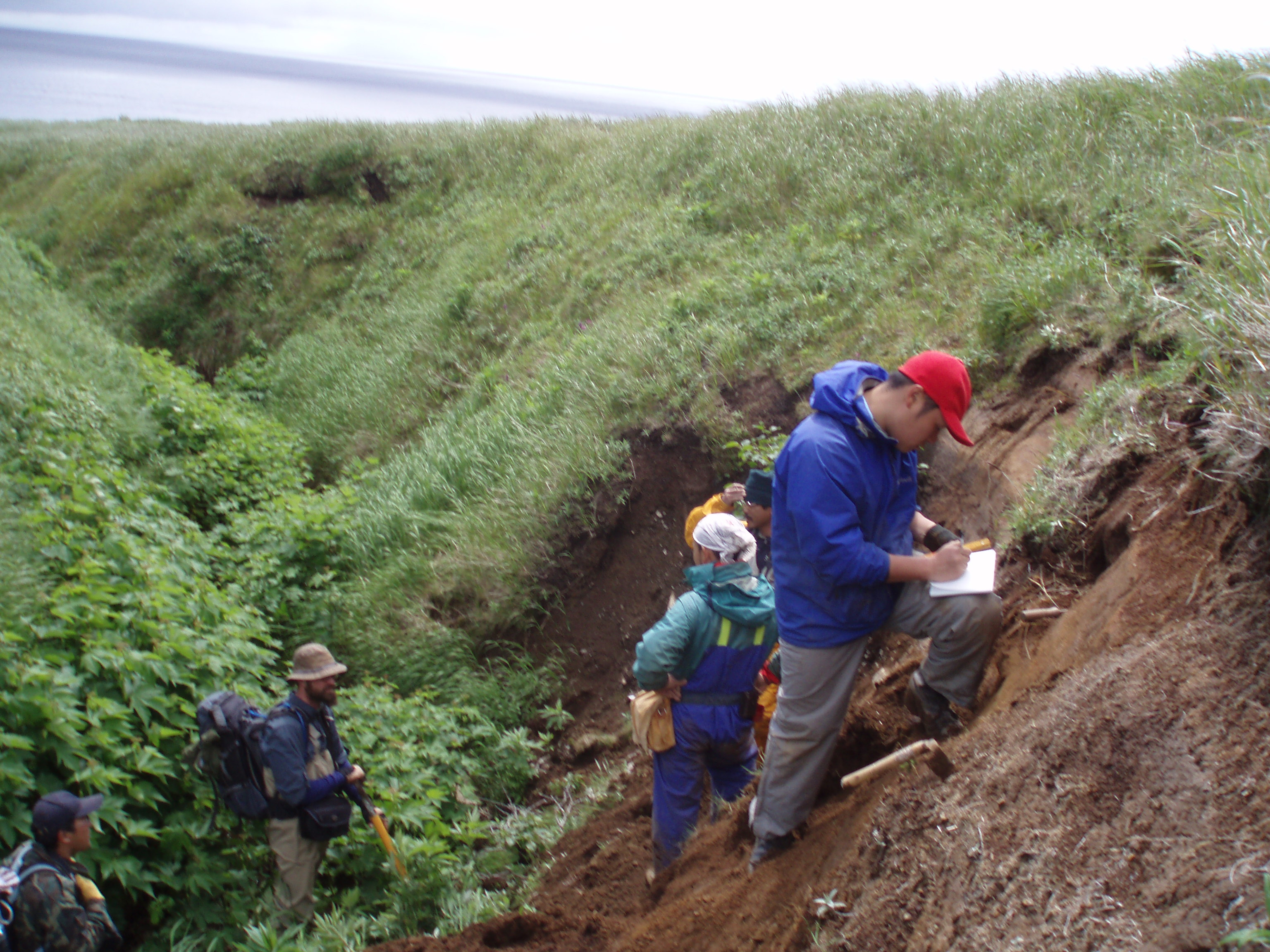 Documenting the stratigraphy of an exposed erosional face. From left to right: Dima Chvagian, James Taylor, Yoshihiro Ishizuka, Mitsuhiro Nakagawa, and Ahira Baba. Shiashkotan, Kuril Islands, Russia.