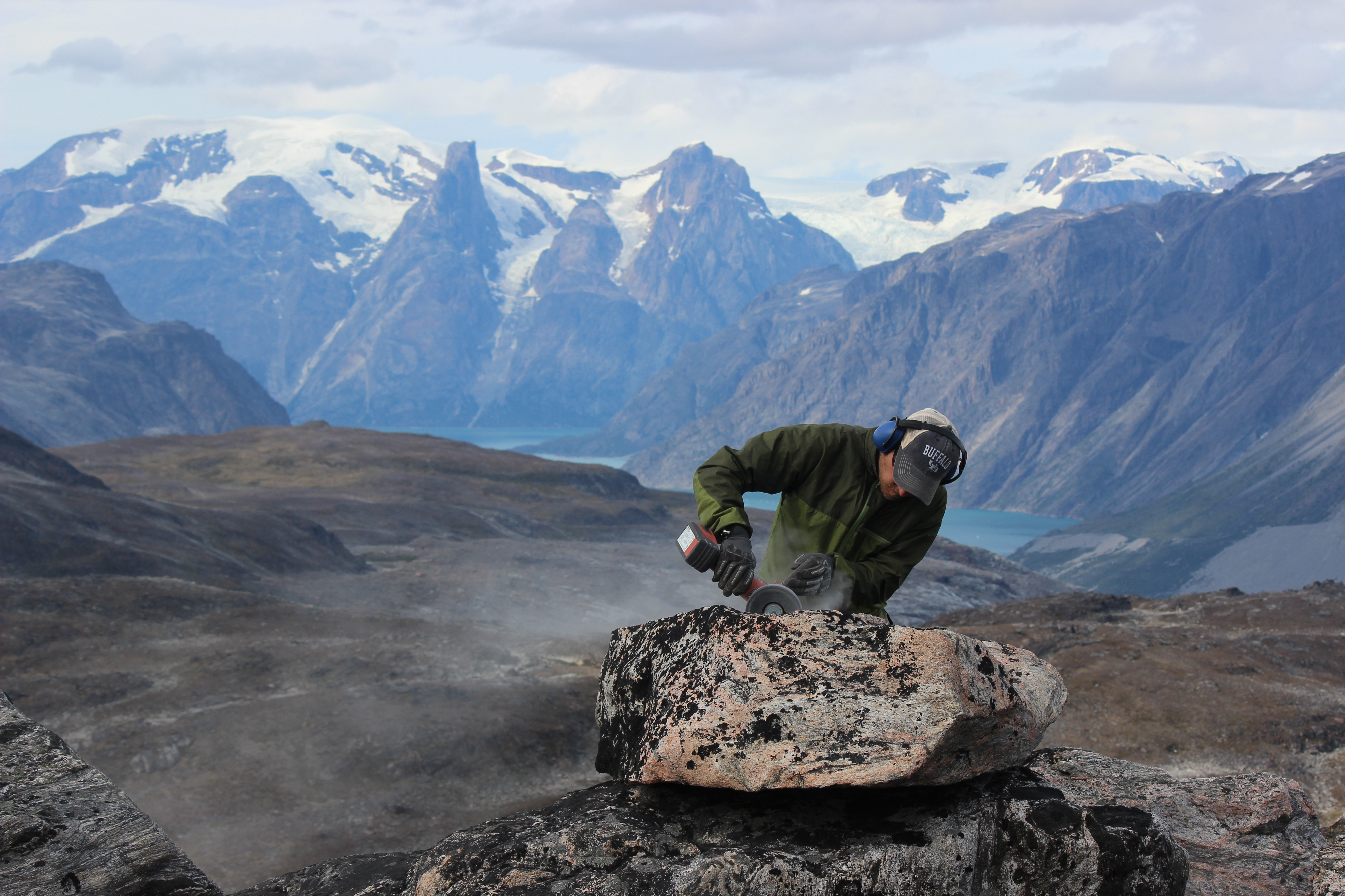 Dr. Jason Briner cuts a sample from a glacial erratic. Nunatarssuaq, Greenland.