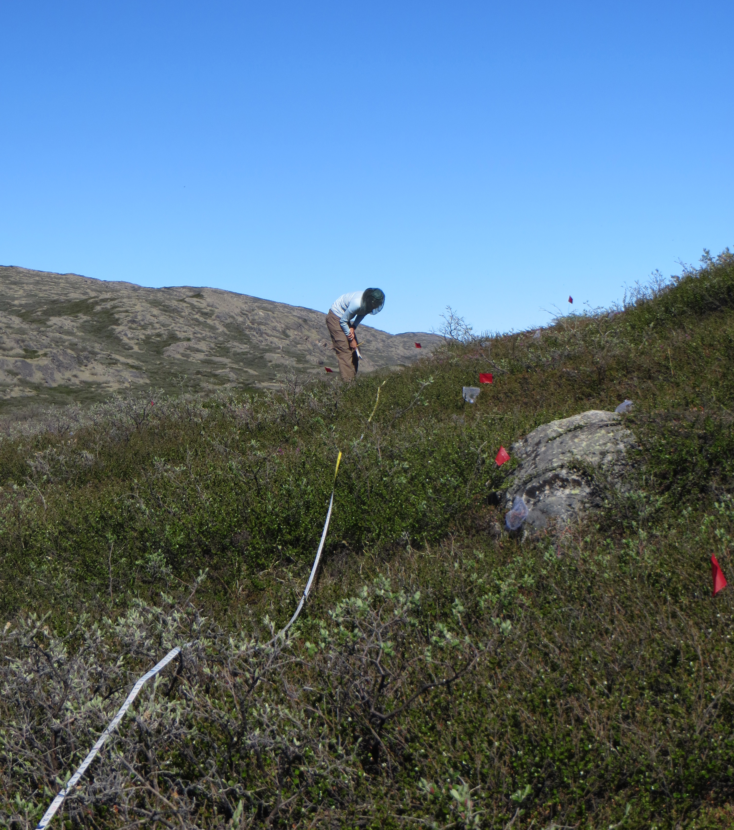 Team members determine the vegetation in a plot by laying a measuring tape out and writing down what and how many plants are present each half meter. Outside of Kangerlussuaq, Greenland.