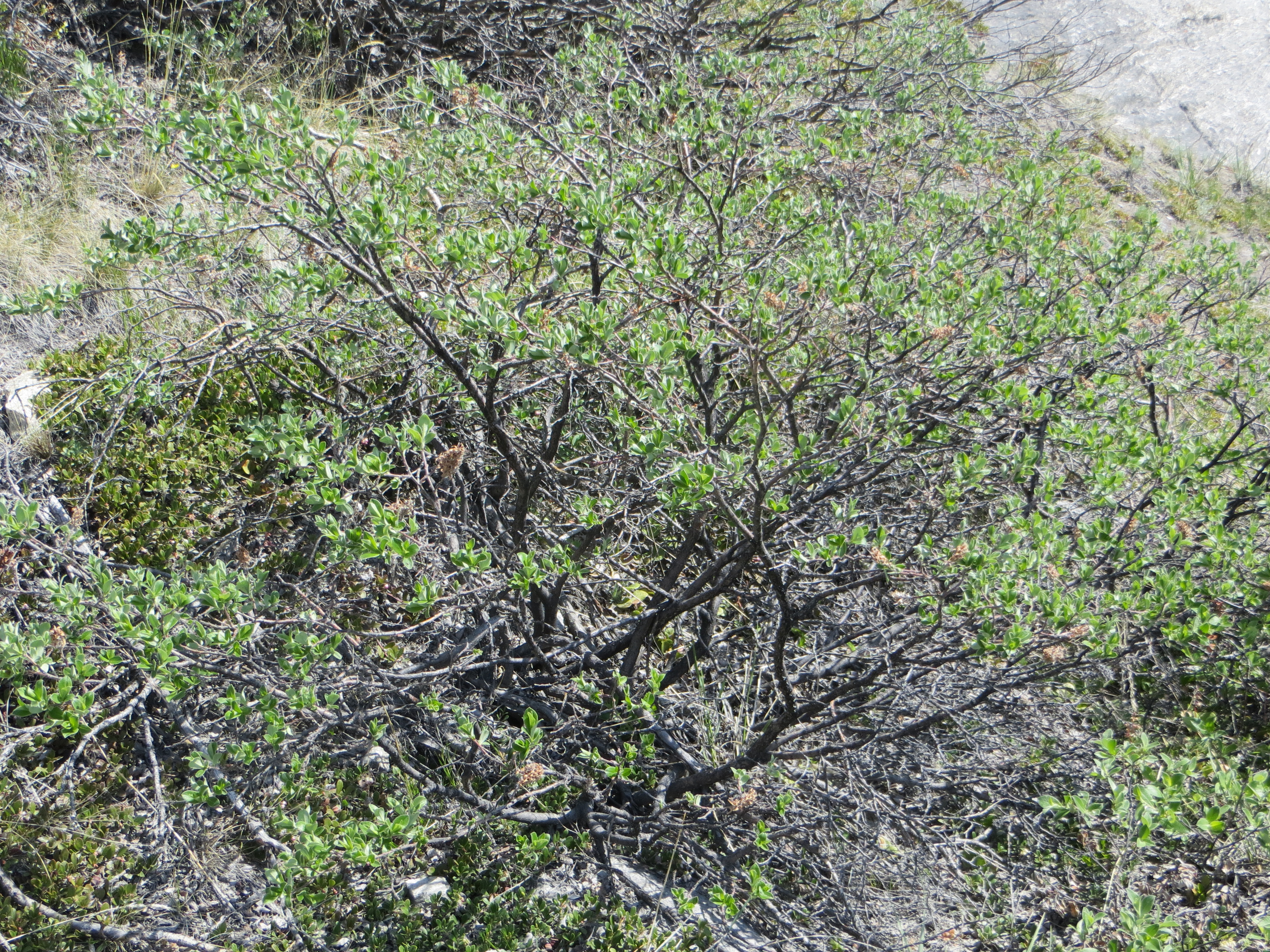 Salix glauca (gray leaf willow) is one of the three plant species that the team is studying. It is a very woody shrub. Outside of Kangerlussuaq, Greenland.