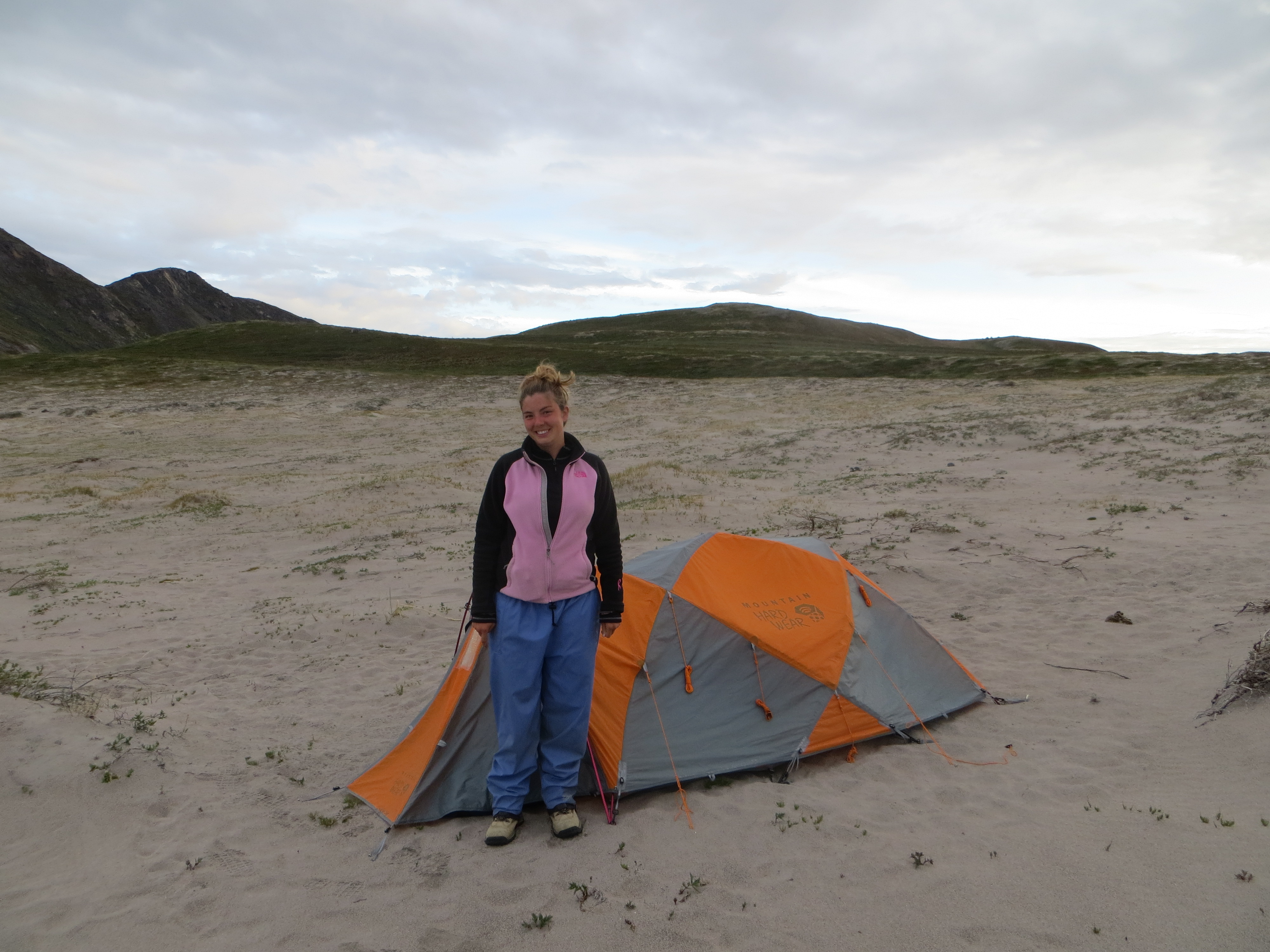 Emily Dodson in front of her tent, outside of Kangerlussuaq, Greenland. Emily Dodson: "This tent is very warm and I usually get hot at night." Outside of Kangerlussuaq, Greenland.