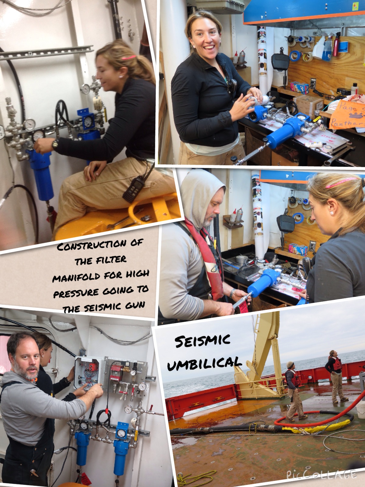 A collage of the marine tech crew as they prepare for the research component of the cruise by working on the multi-channel seismic system. Aboard the R/V Nathaniel B. Palmer icebreaker.