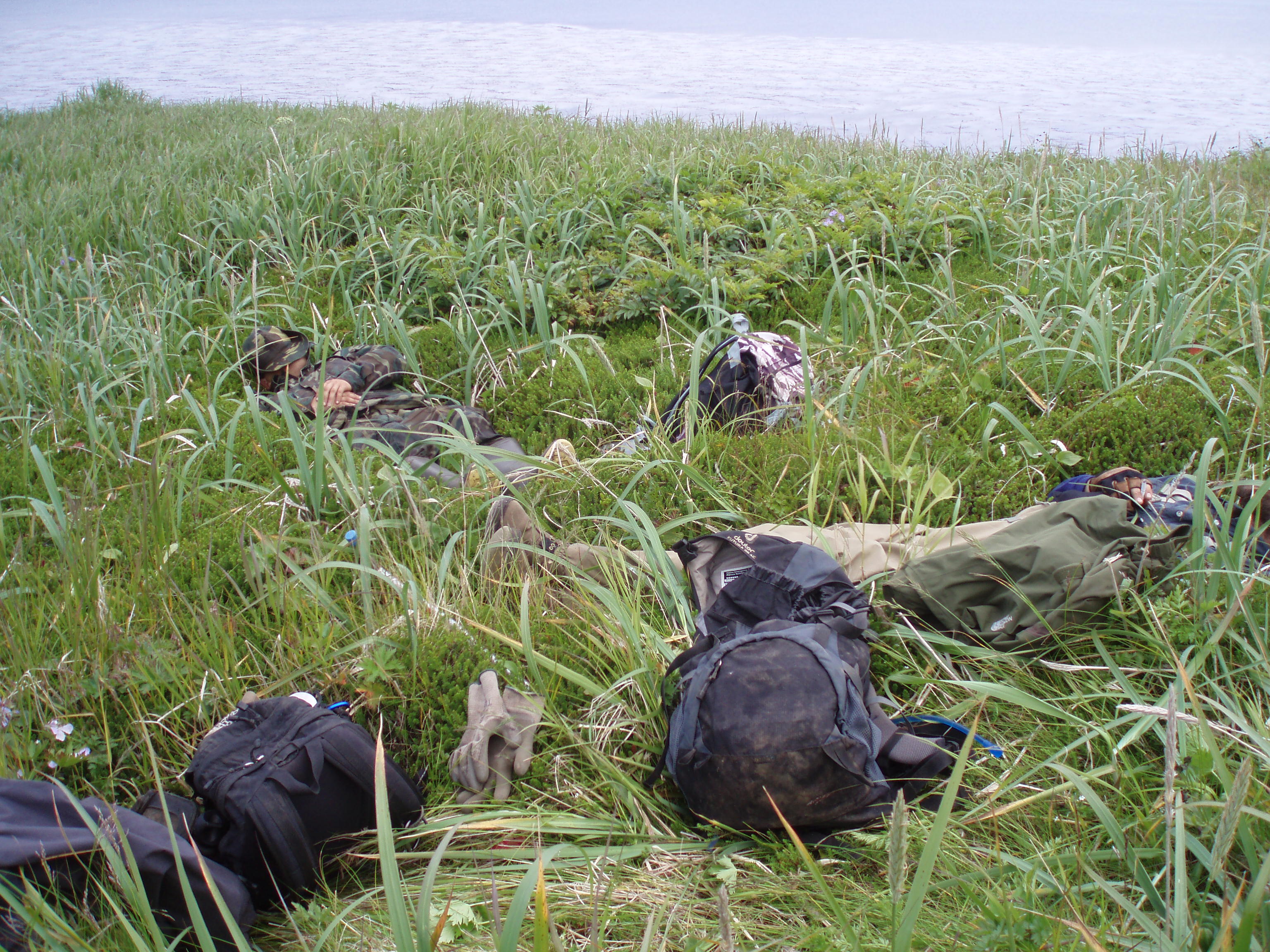 Dima Chvagian and James Taylor take a short breather while Matt Walsh prepares to survey further along the terrace. Ekarma, Kuril Islands, Russia.