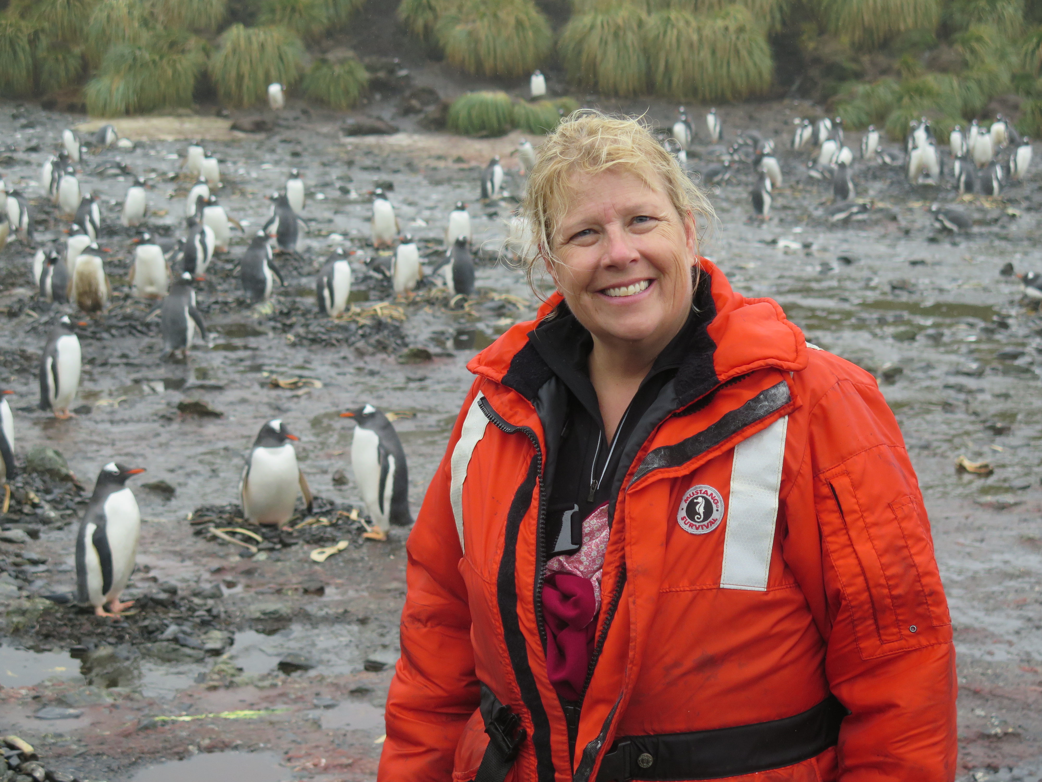 Jillian Worssam at the gentoo penguin colony on Bird Island, South Georgia.