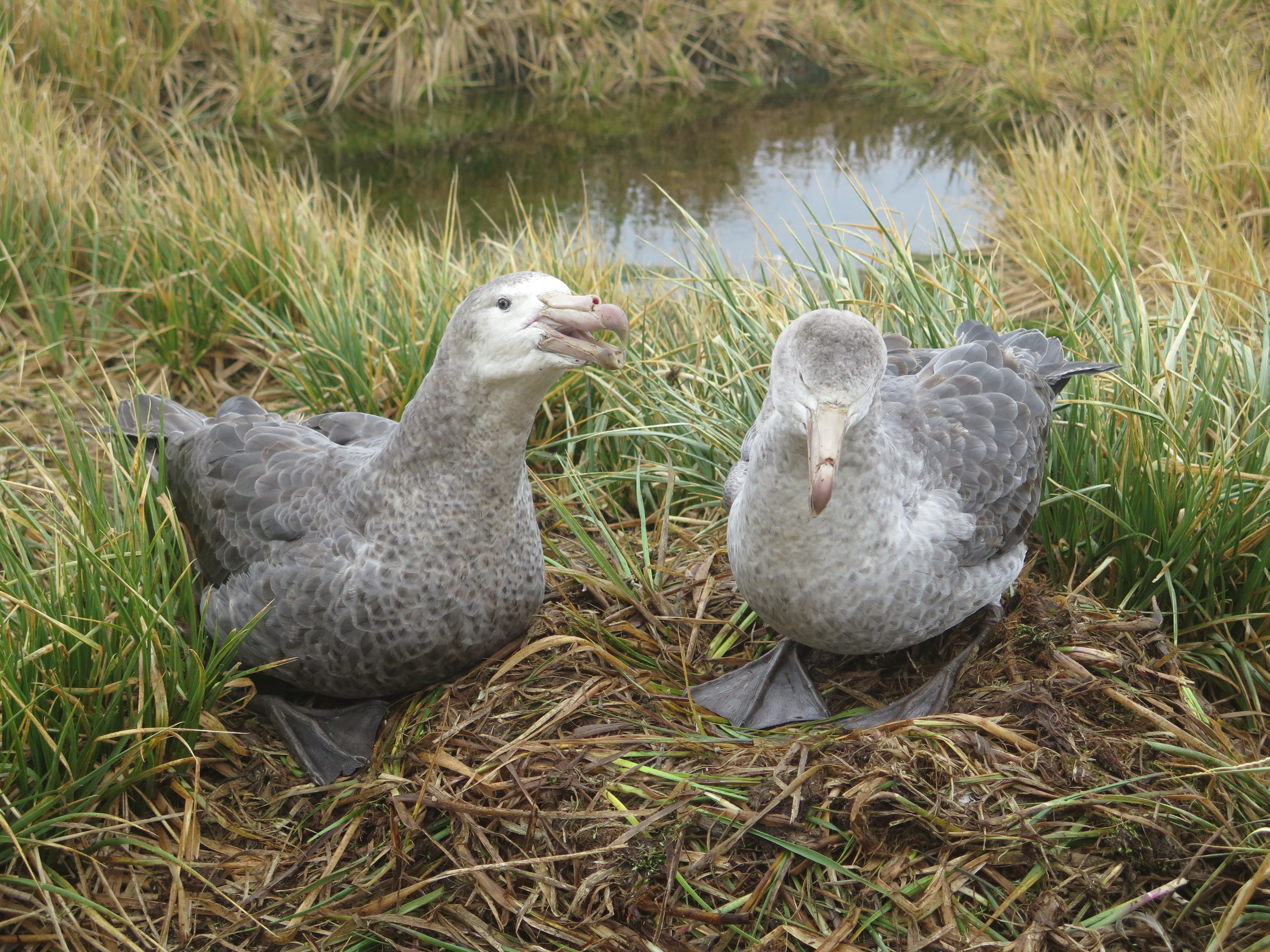 A breeding pair of giant petrels on Bird Island, South Georgia.