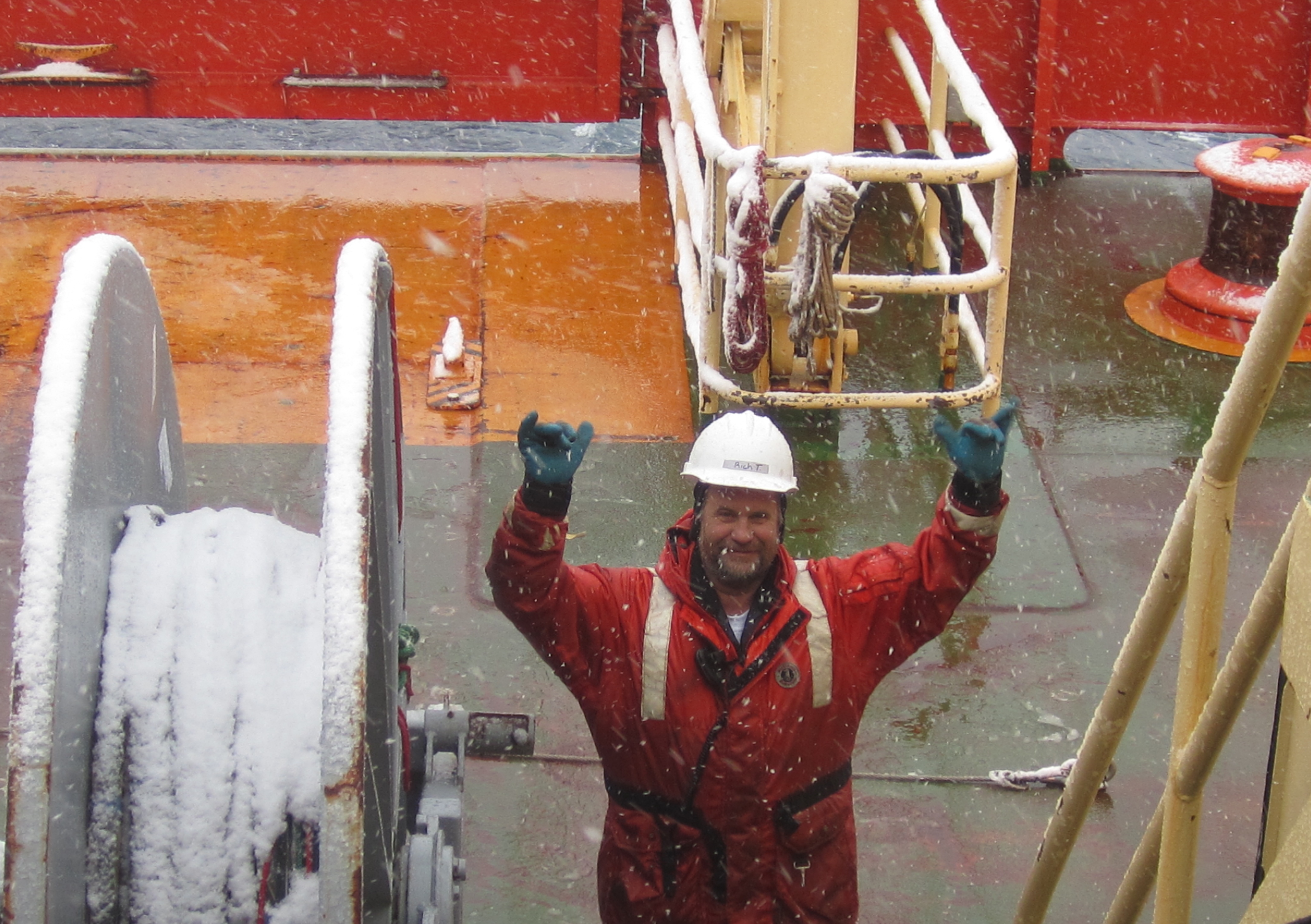 Snow on the equipment during a small snow storm. Aboard the R/V Nathaniel B. Palmer icebreaker, transiting back to Chile.