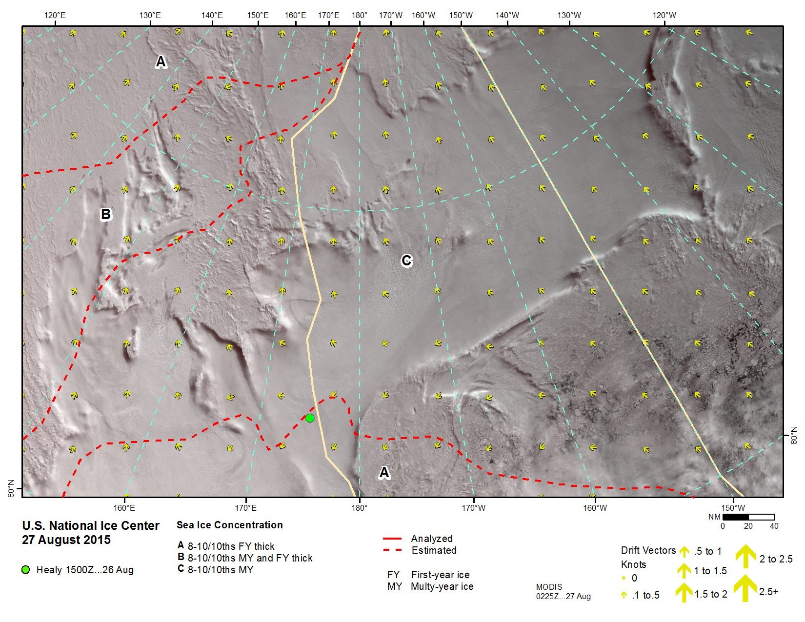 A sea ice concentration map for the area around Healy (green dot) for August 27, 2015. The Healy is in area “A”, composed of 1st-year ice covering 8/10 to 10/10 of the surface. Aboard the USCGC Healy in the Makarov Basin, South of the North Pole. 83.73°, 174.90°.