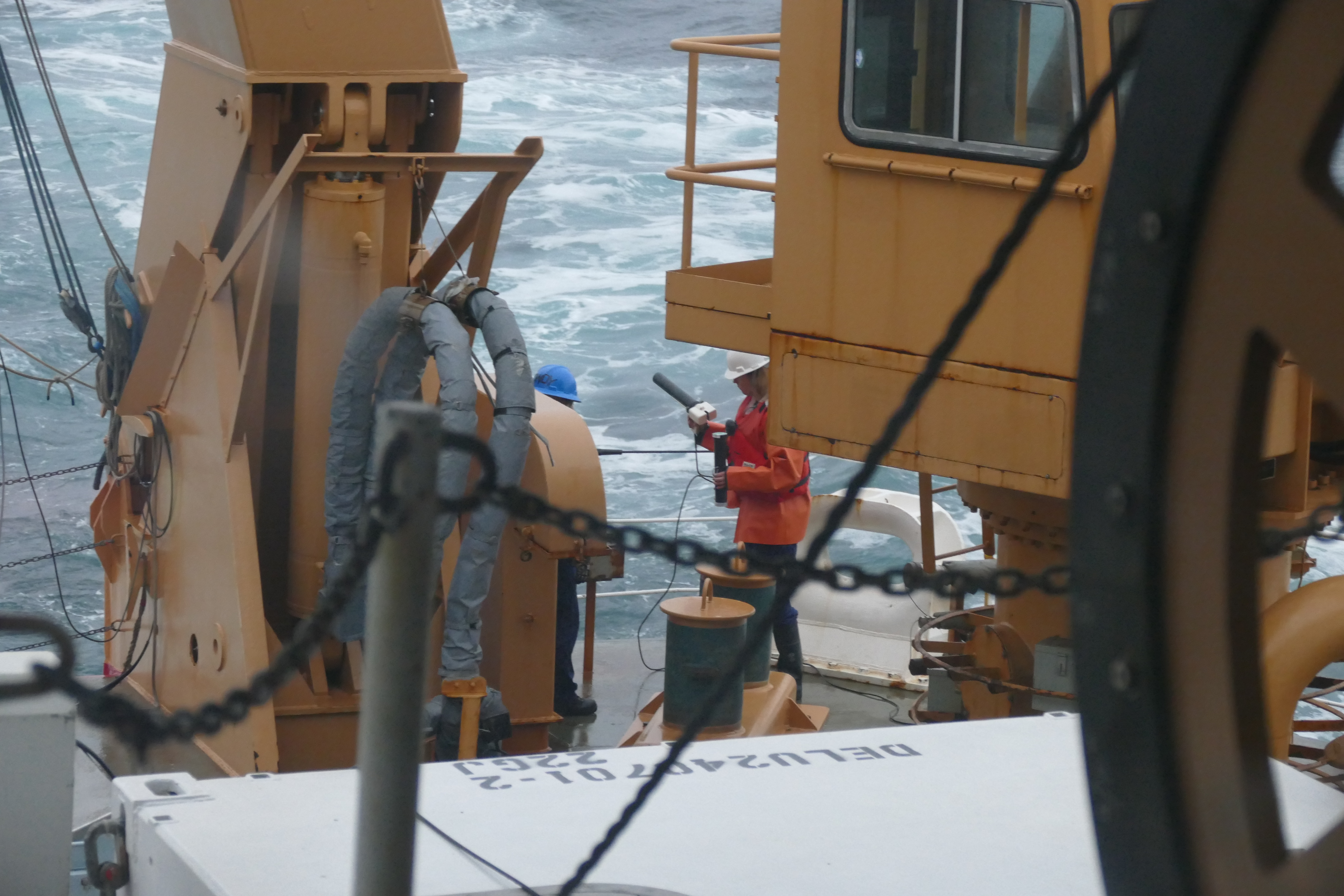 Chief Marine Science Technician Karen Aquino launches an XBT (Expendable Bathythermograph) in the rough seas. XBTs give oceanographers a quick look at the water column by reporting temperature vs. depth back to the ship as they sink. They are not retrieved after they are used, thus the expendable part of their name. Aboard the USCGC Healy in the Chukchi Sea. 71.01°, -167.74°.