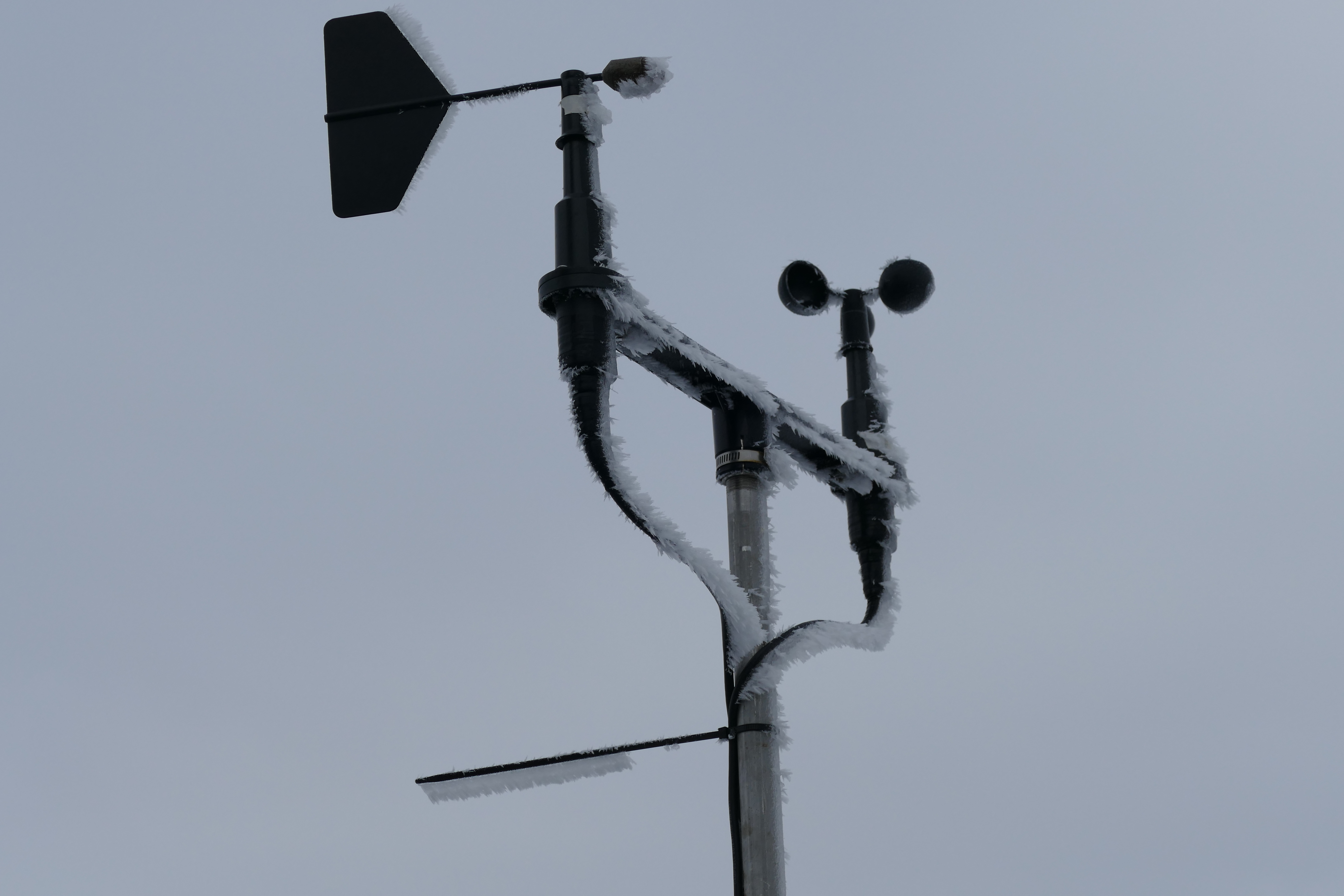 The aerosol sampler system anemometer (right) and wind vane (left) become iced up. Aboard the USCGC Healy at the Mendelev Rise in the Arctic Ocean. 81.23°, 179.10°.