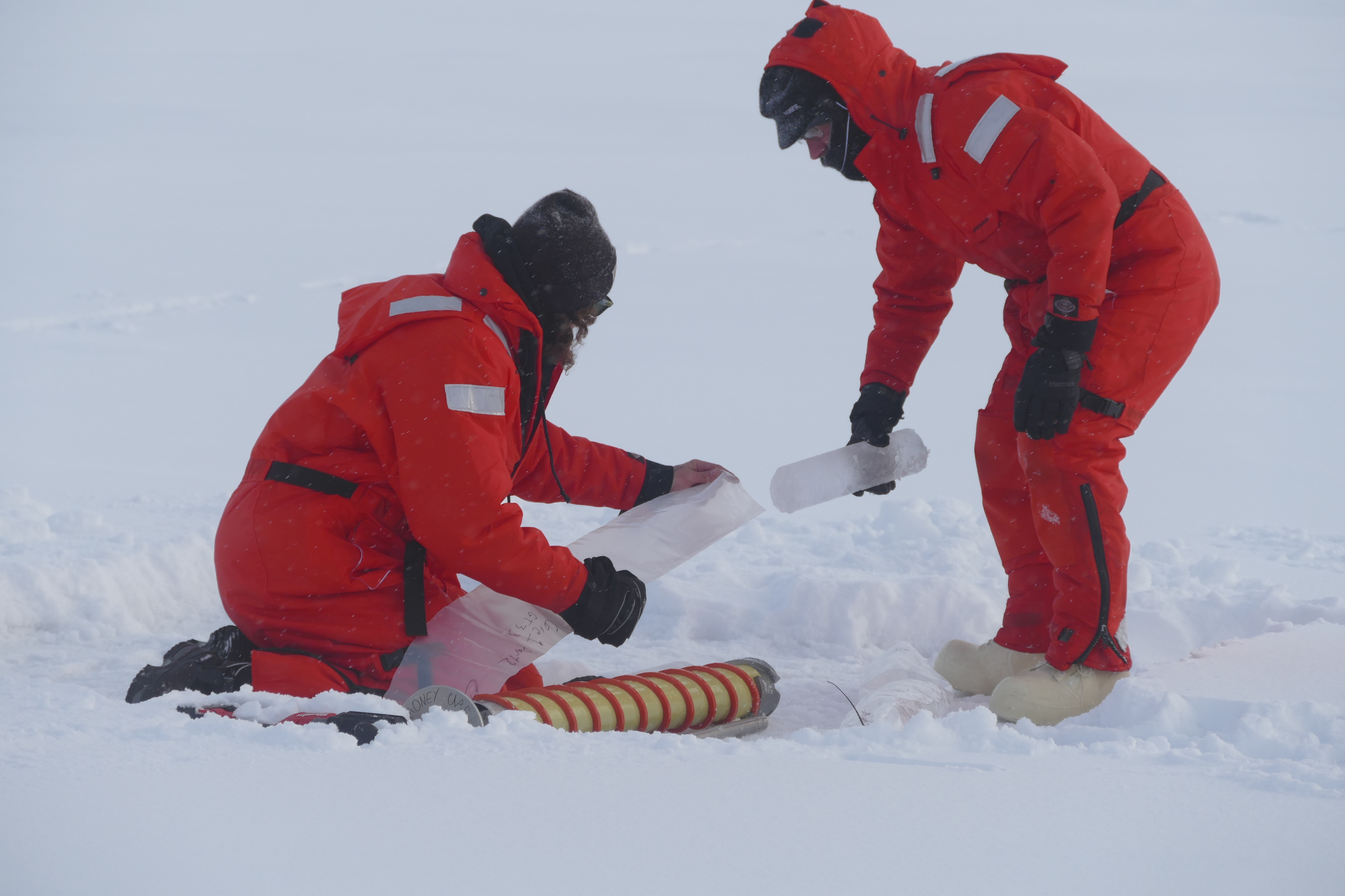 Kyle Dilliplaine and Carl Lamborg collect an ice core sample at the North Pole. Near the USCGC Healy at the North Pole.