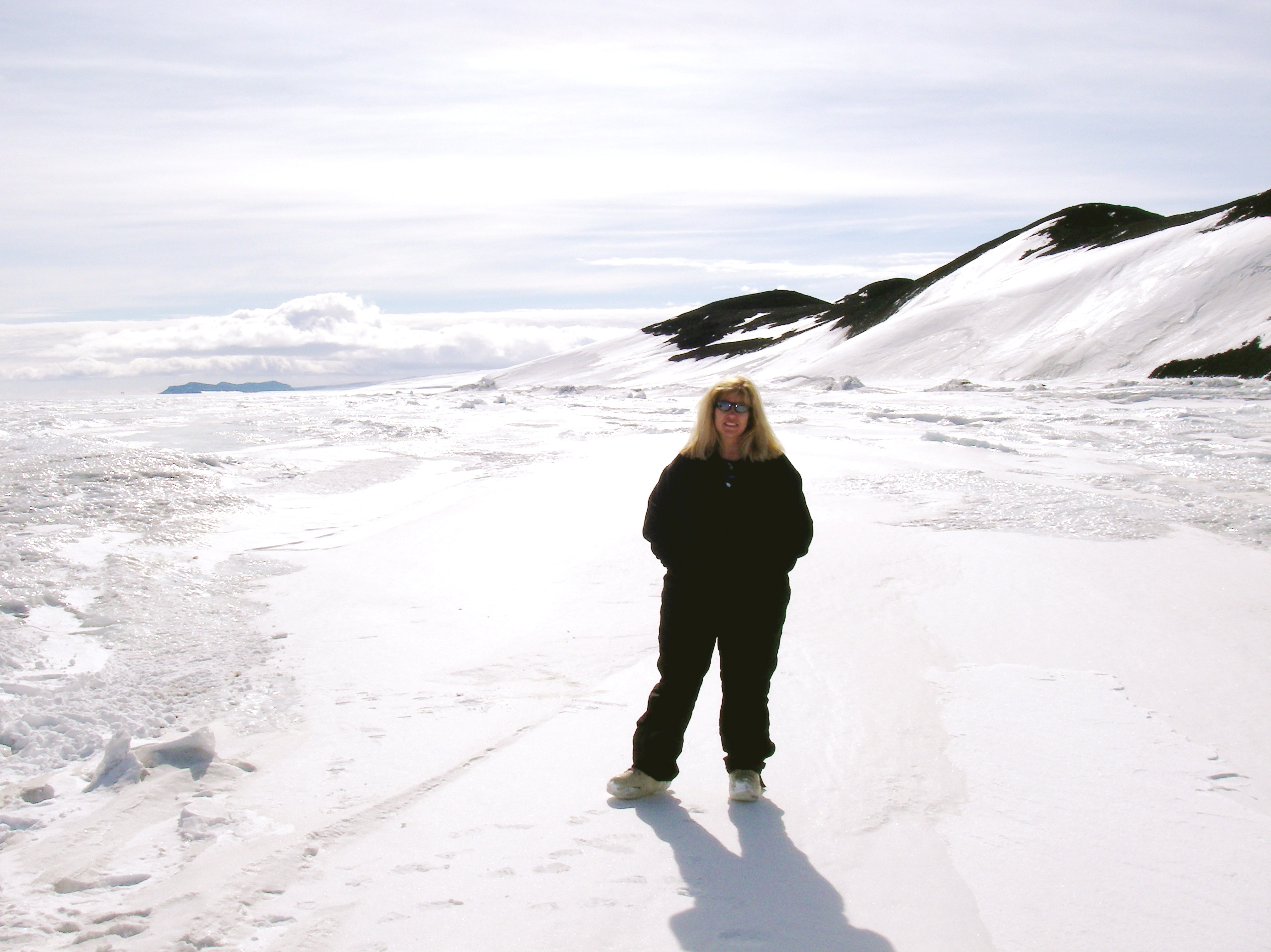 Ann Linsley on the sea ice at Cape Armitage, Antarctica on a beautiful day with no wind.