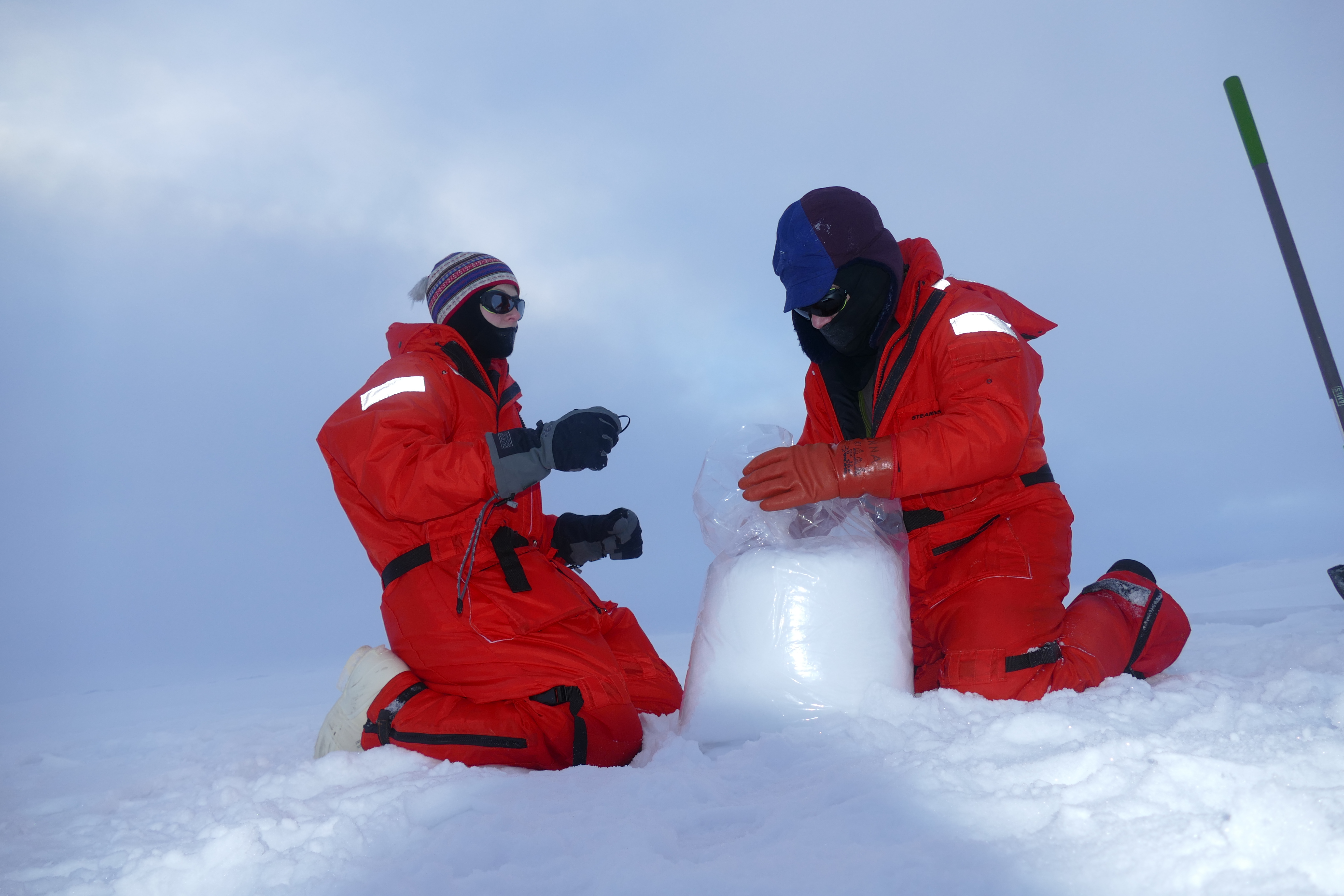Tim Kenna and Alison Agather collect and bag up snow samples to bring back aboard for subsequent analysis. Aboard the USCGC Healy at the Alpha Ridge in the Arctic Ocean. 85.14°, -149.87°.
