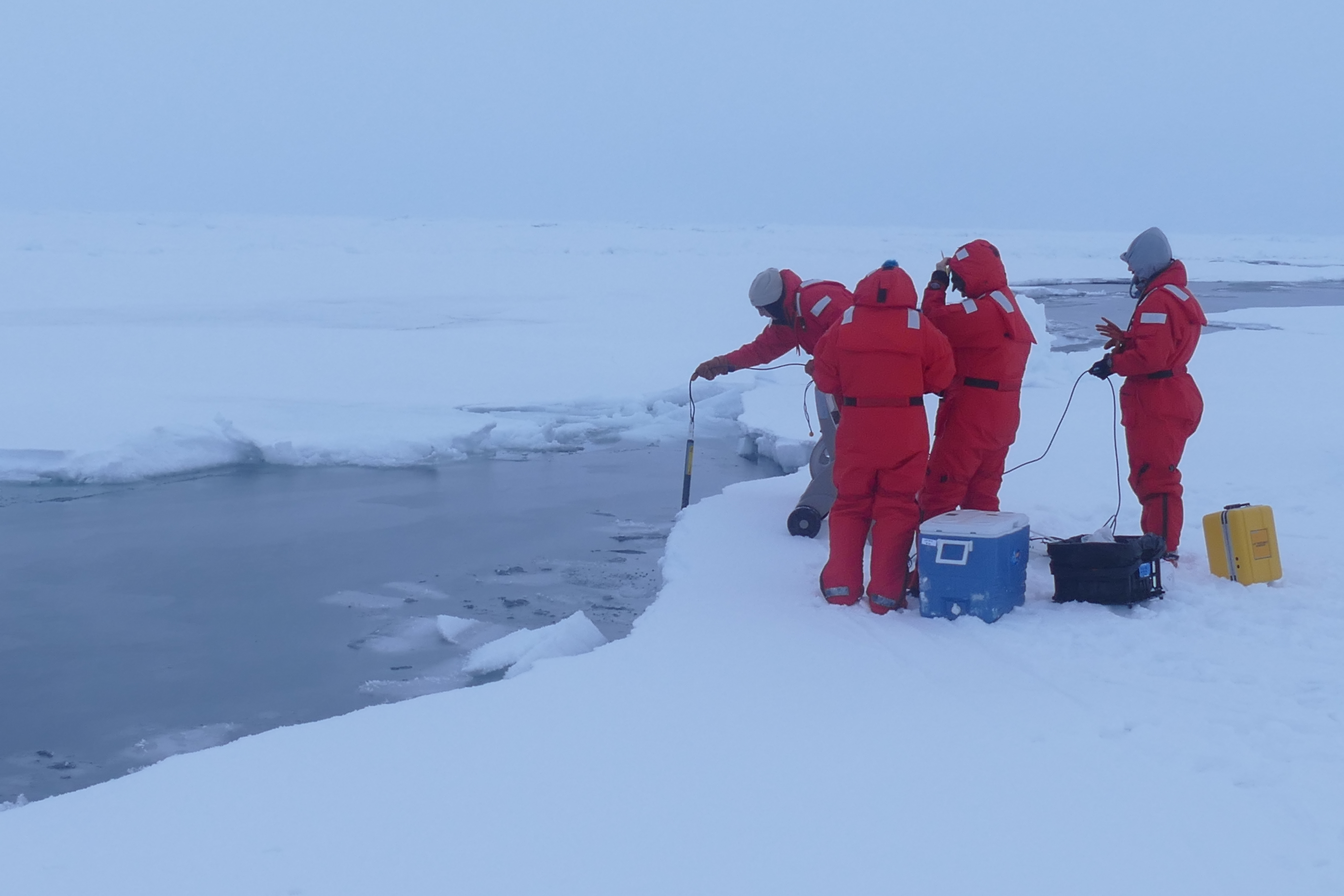 Chris Measures, Mariko Hatta, Johna Winters, and Andrew Barna deploy a portable CTD (conductivity, temperature, and depth instrument) at the ice edge to profile the upper water column prior to sampling. Aboard the USCGC Healy at the Alpha Ridge in the Arctic Ocean. 85.14°, -149.87°.