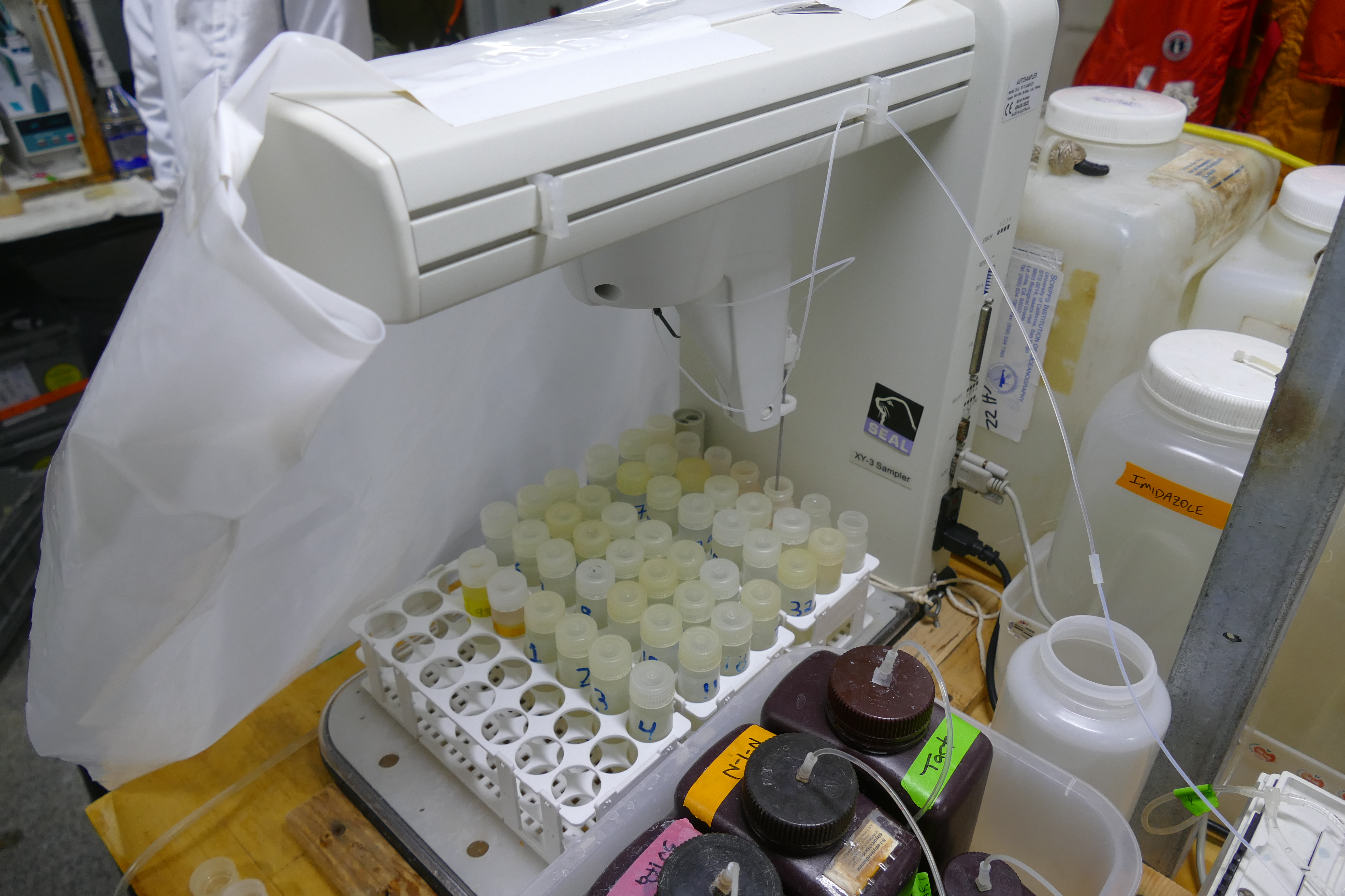 The water samples are each measured in turn, starting with this robotic sampler. Aboard the USCGC Healy in the Canada Basin. 74.95°, -150.23°.