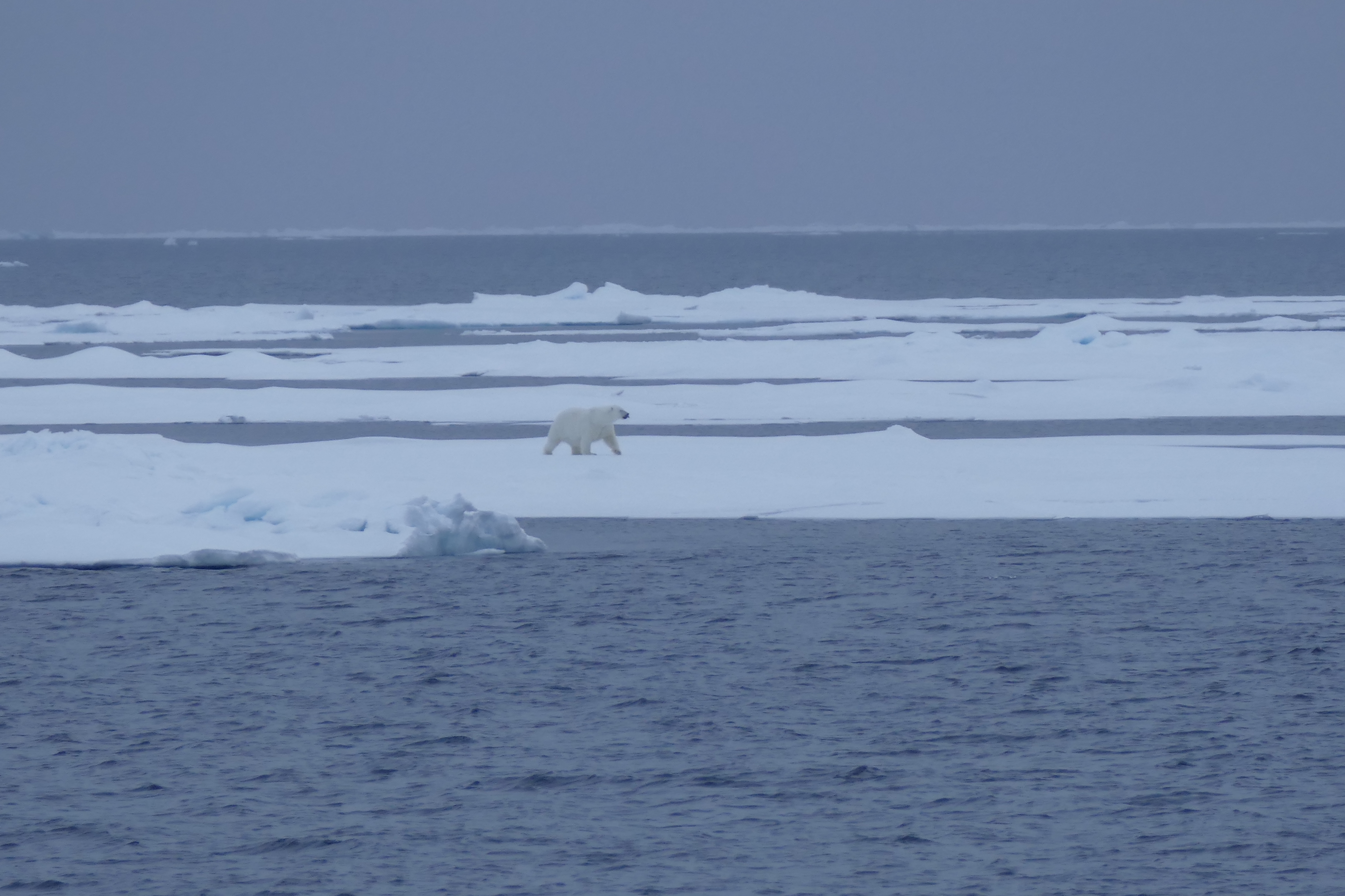 Bill Schmoker: "The second polar bear of the cruise came along soon after the first was spotted. It appeared to be a very well-fed individual!" Aboard the USCGC Healy at the Mendelev Rise in the Arctic Ocean. 76.58°, -173.27°.