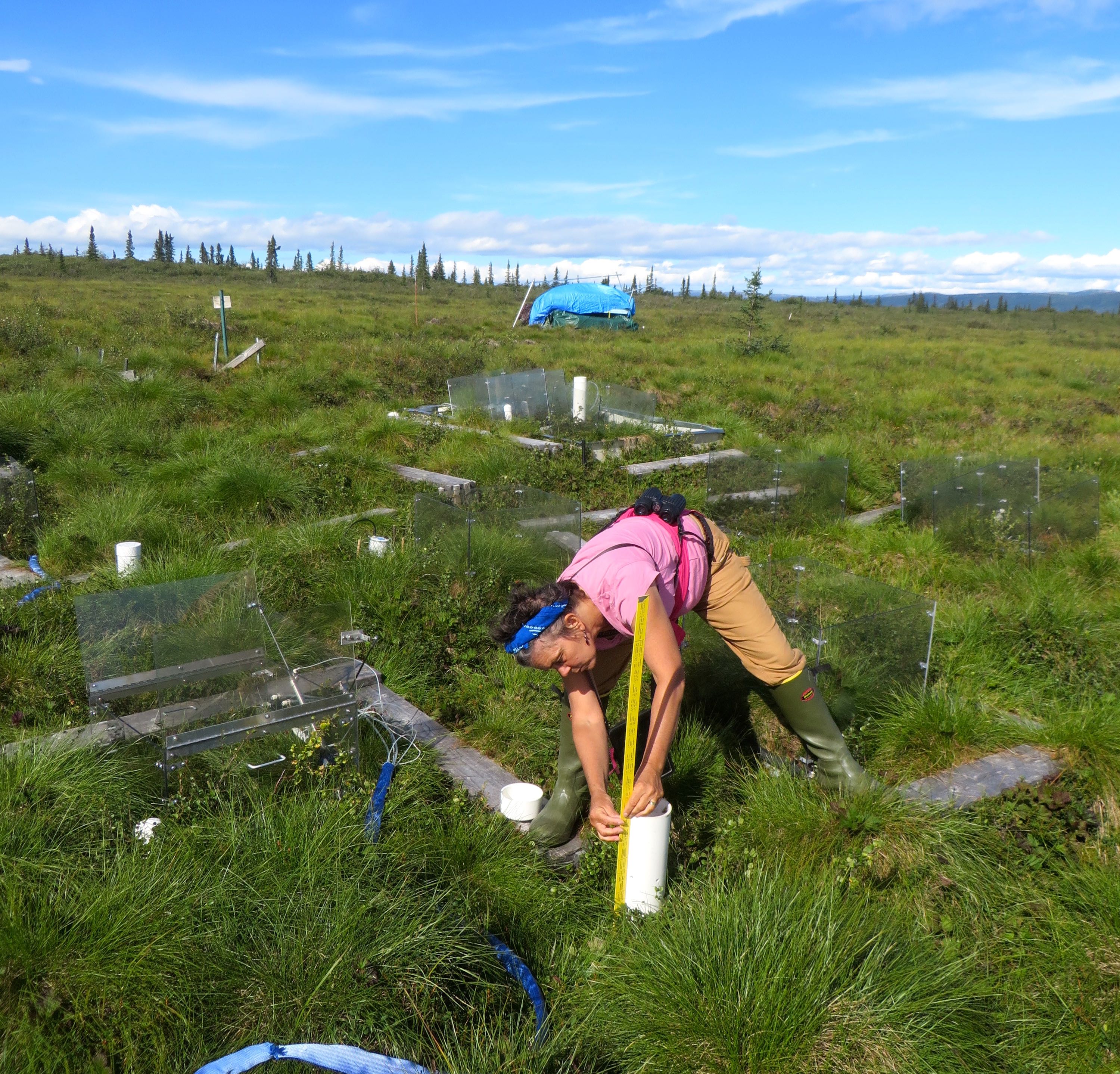 A depth of soil surface measurement is taken. At the CiPEHR site, near Healy, Alaska.