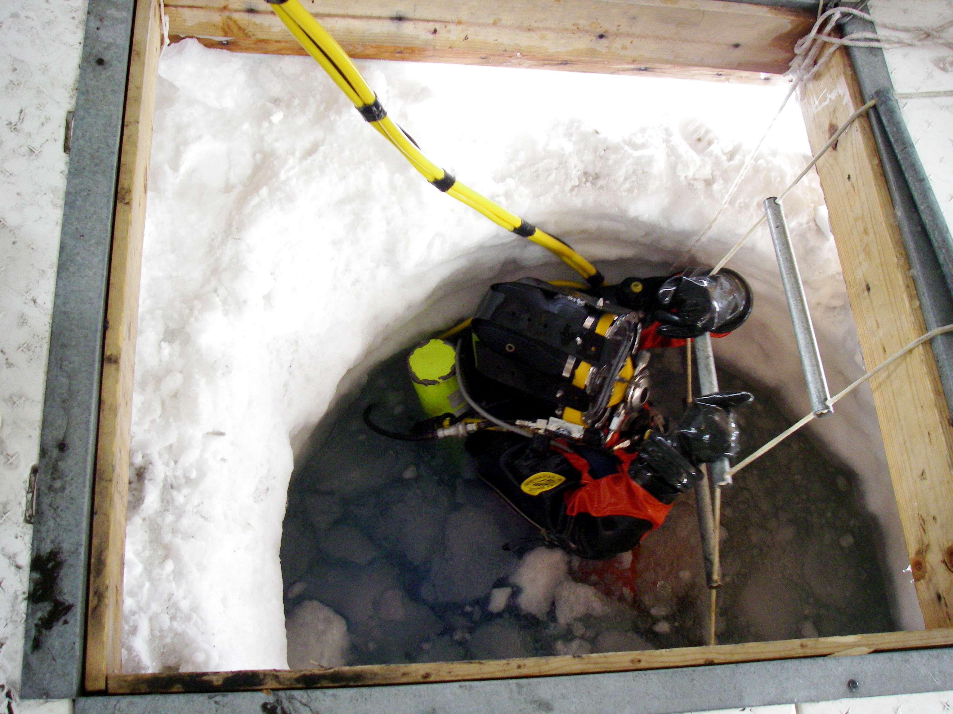 Addie the diver comes up again from the dive hole after collecting a sediment core and sea creatures. Harbor of McMurdo Sound, Antarctica.