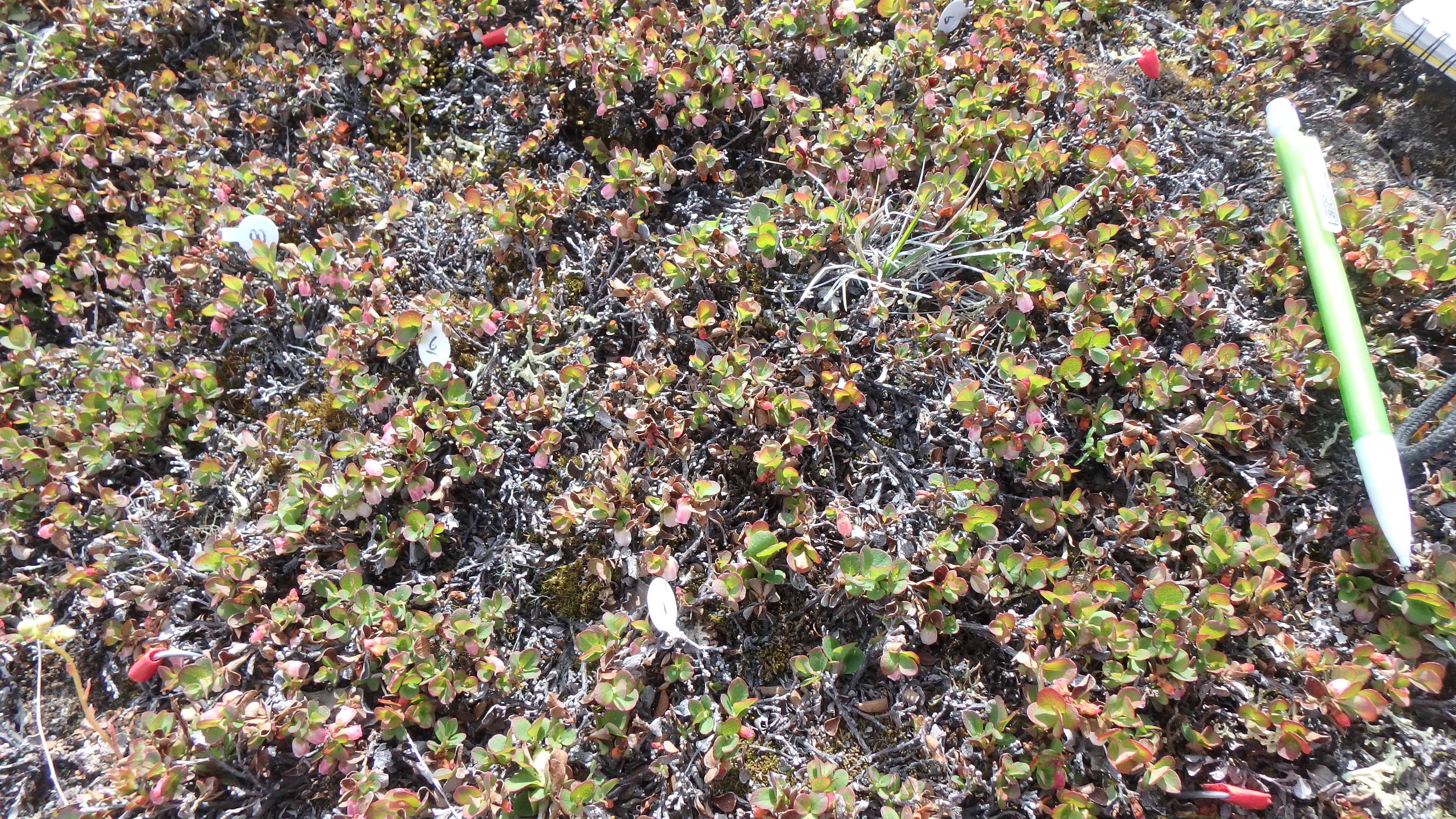 The tundra plants are very low to the ground in this 0.25 square meter plot. Kangerlussuaq, Greenland.
