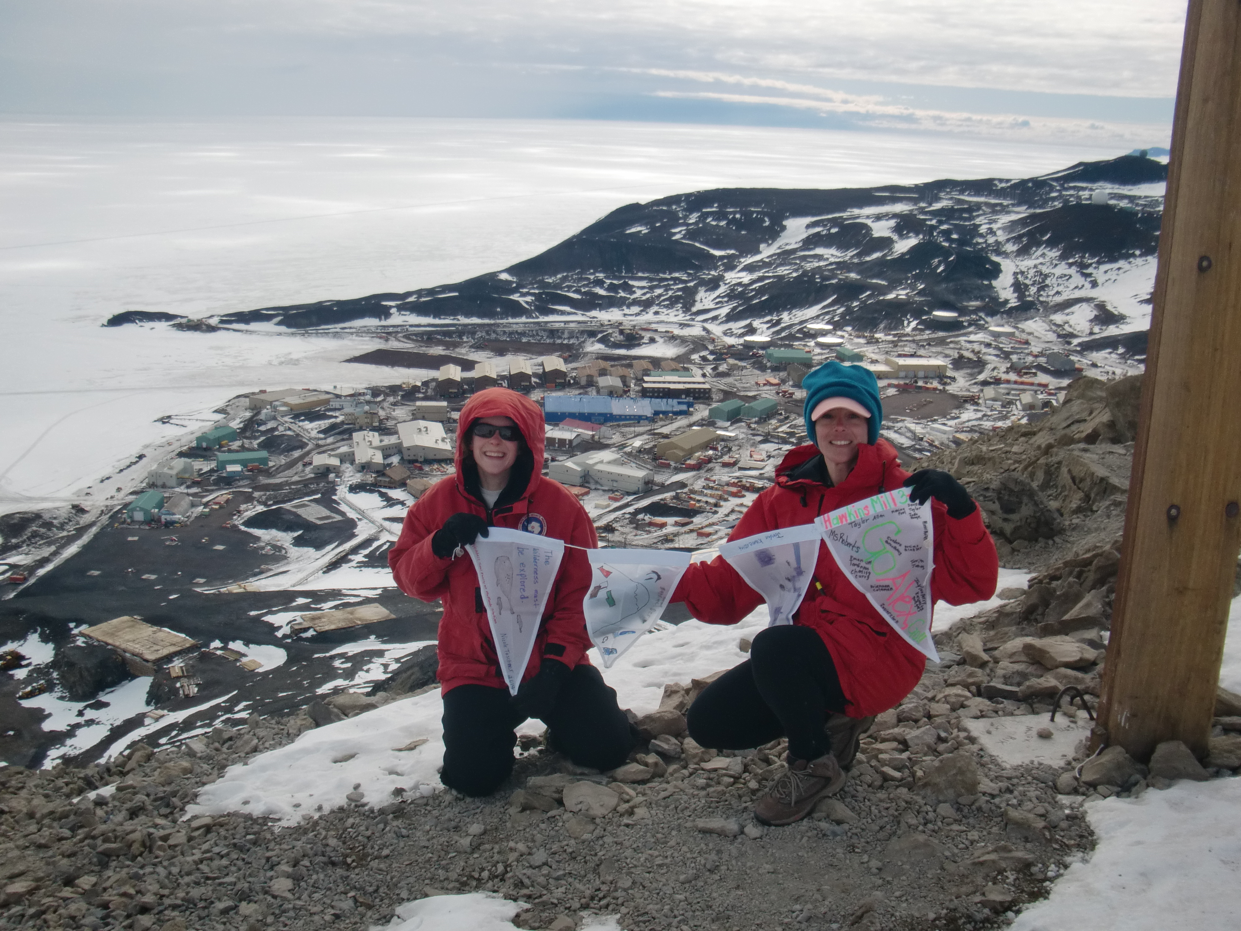 A string of student-made flags fly for Alex Eilers' Fly a Flag Challenge at the top of Observation Hill in McMurdo Station, Antarctica.