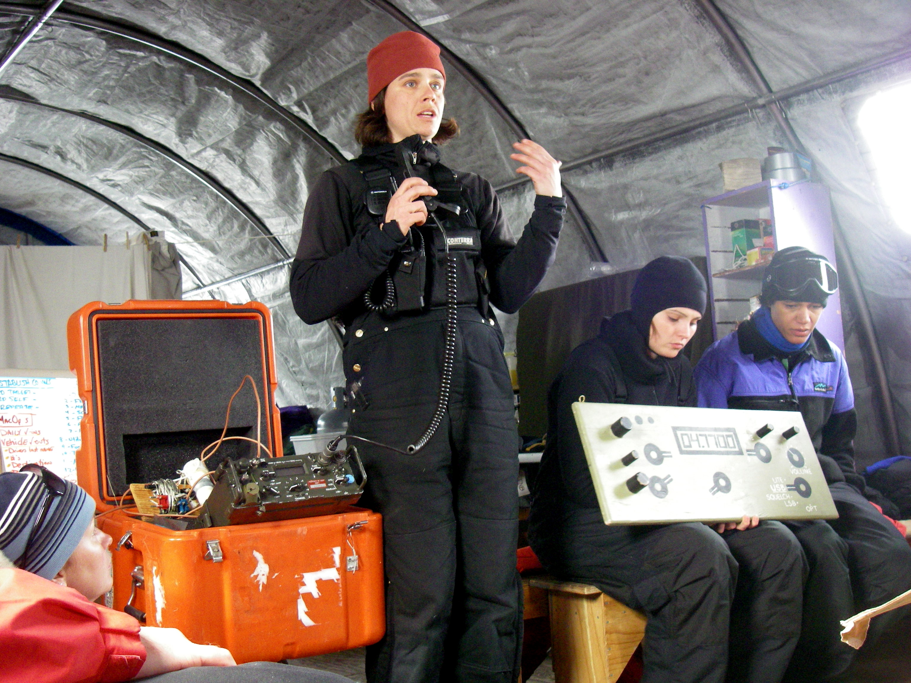 Ann Linsley: "How to use the relay communication station in the event of emergency. It's good to know that equipment from WWII is still in good working order!" Happy Camper School, Ross Ice Shelf, Antarctica.