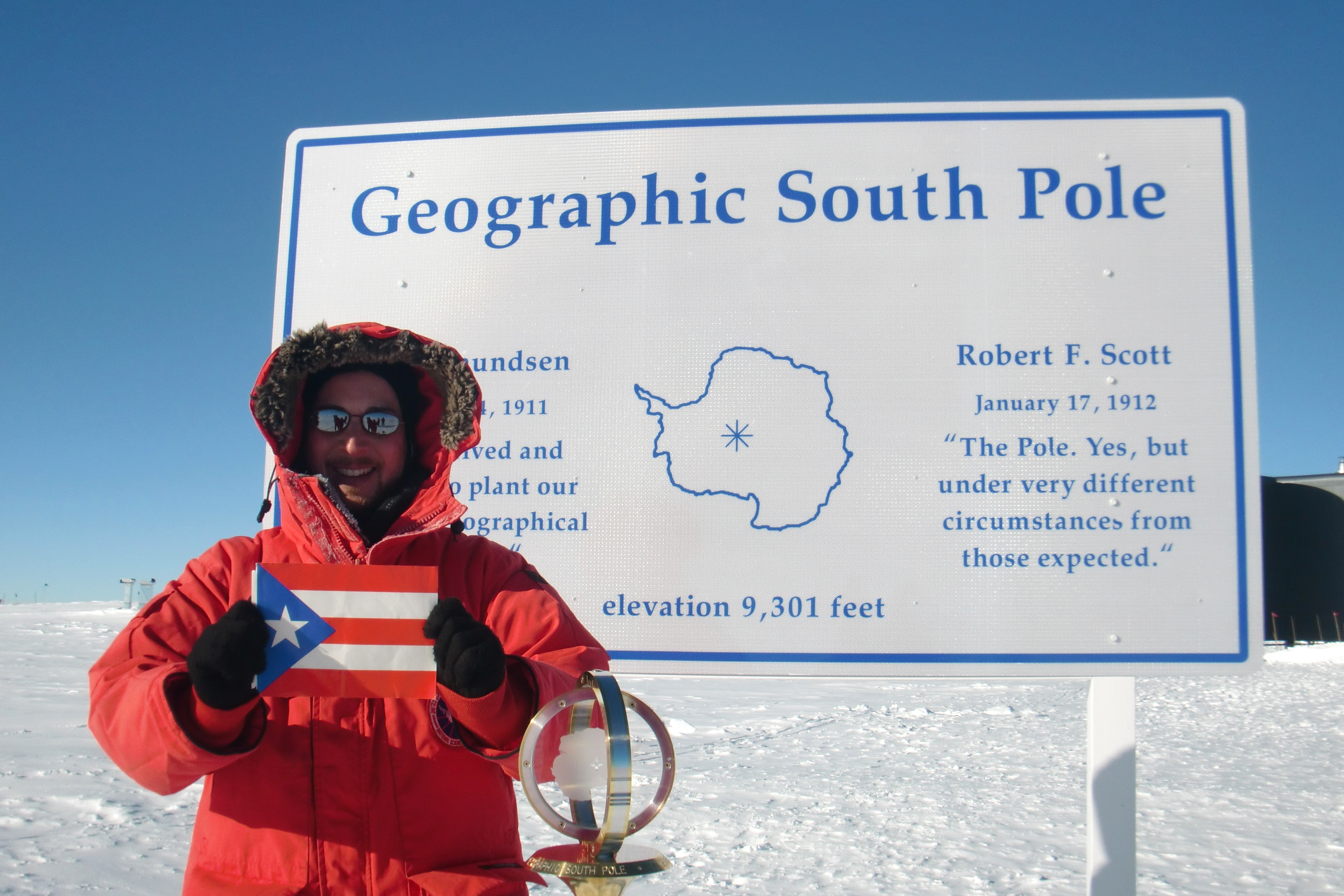Armando Caussade at the geographic South Pole, holding the Puerto Rican flag. Amundsen-Scott South Pole Station, Antarctica.