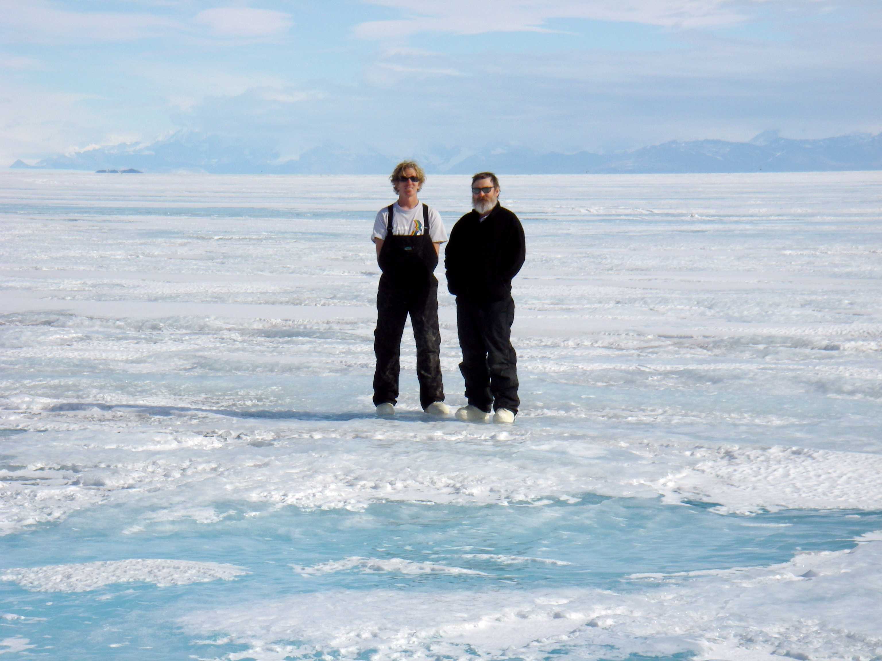 Ann Linsley: "Terry Palmer and Steve Sweet out on the sea ice at the Armitage Point control site. It was cold and very bright but since it was not windy, Terry was proving to us that it was balmy short sleeve weather day." Looking west across the sea ice in the vicinity of McMurdo Station, Antarctica.