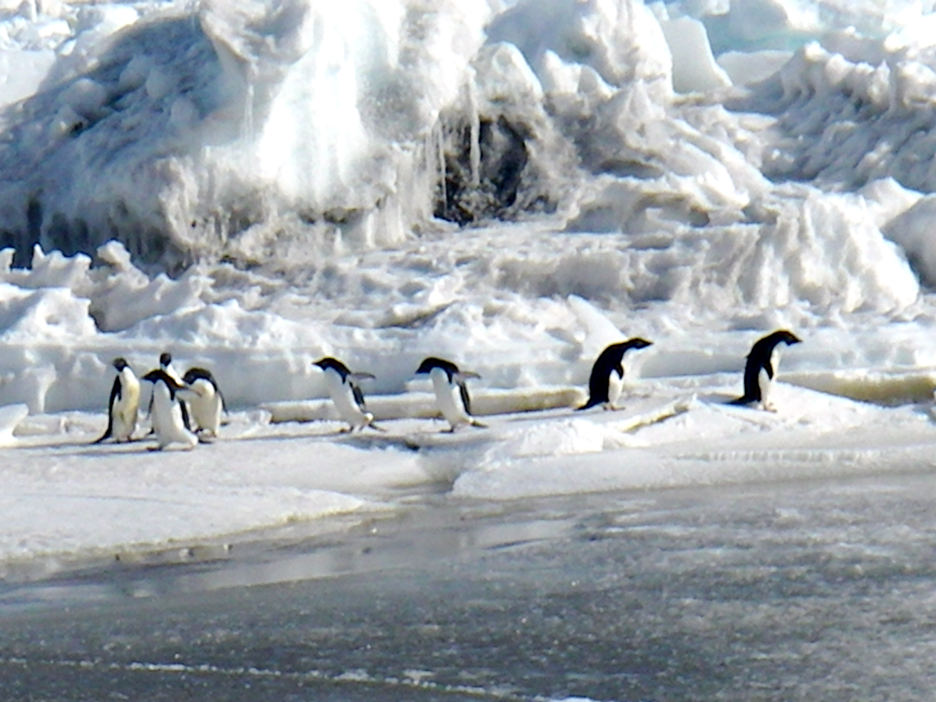 Ann Linsley: "So many decisions! Which way to go? Who to follow? The ice formations made a fabulous background." Cape Bird, Antarctica.