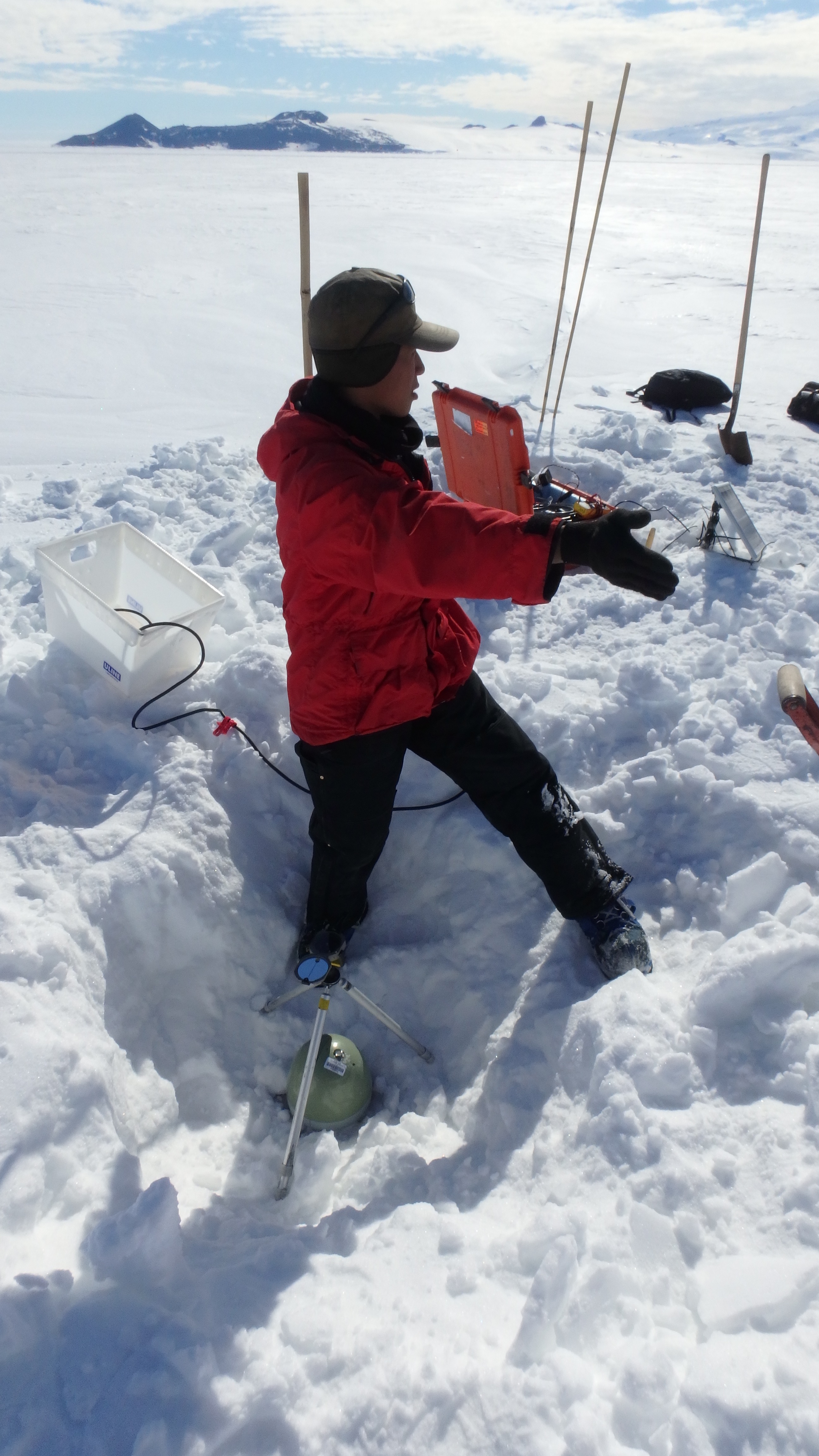 Phil Chung performs a diagnostic check on seismometers. McMurdo Ice Sheet, Antarctica.