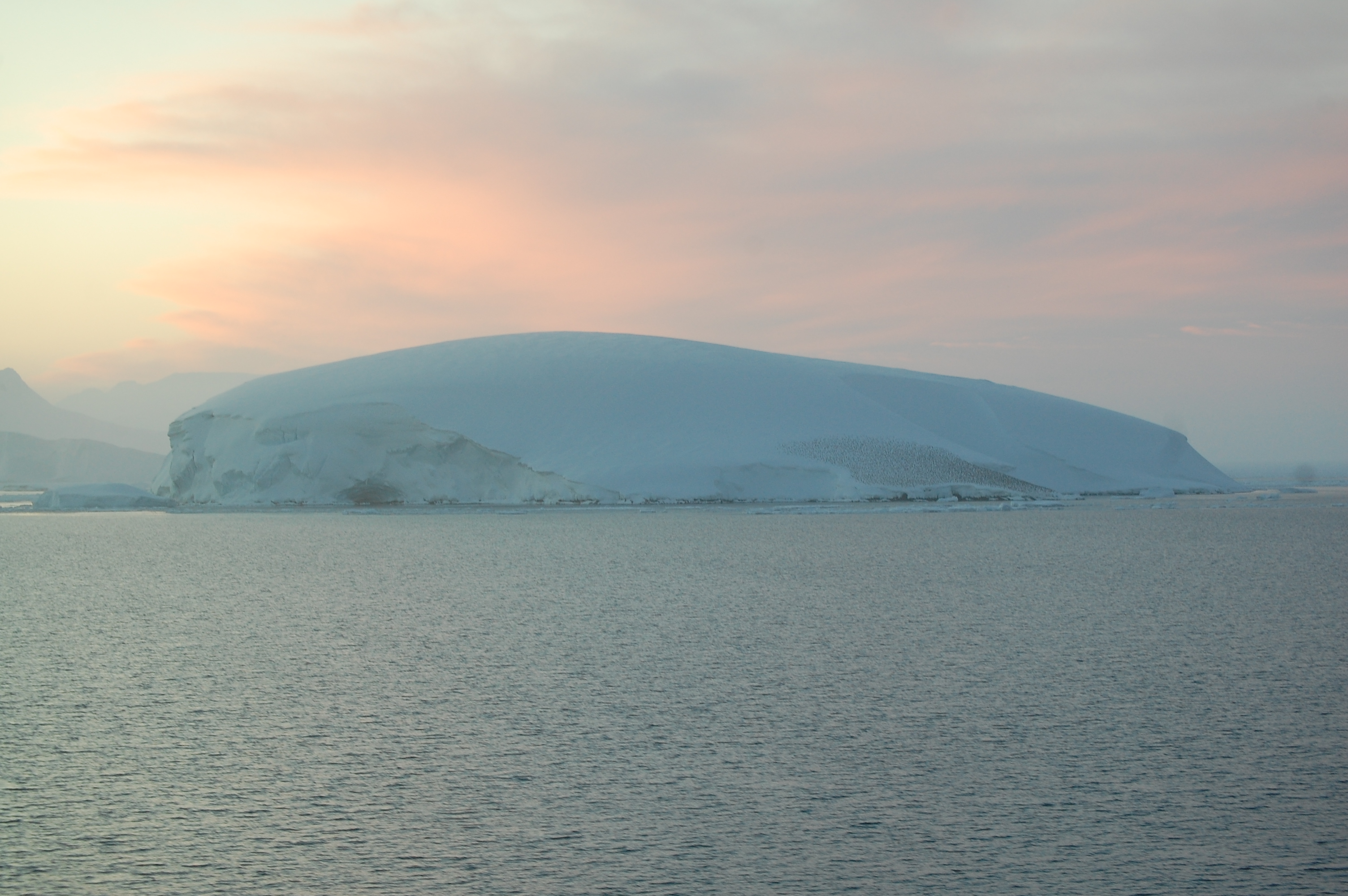 This large iceberg shows a variety of blue hues and white. Towards the right side of the iceberg, there is a large group of penguins. Aboard the Nathaniel B. Palmer in the Gerlache Strait.