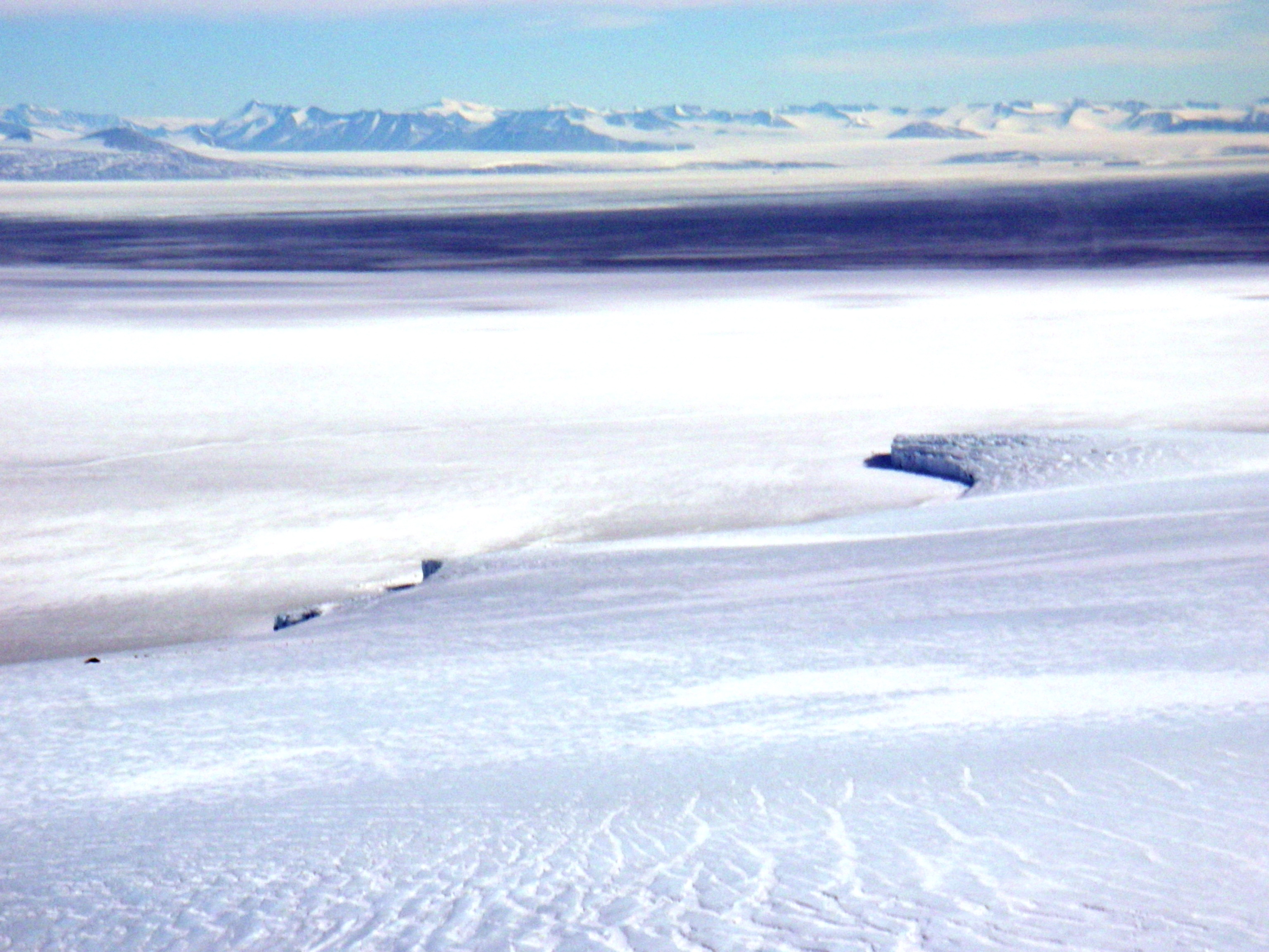 Glacier coming off of Mt. Erebus meeting the sea ice and the open waters. Ross Island, Antarctica.