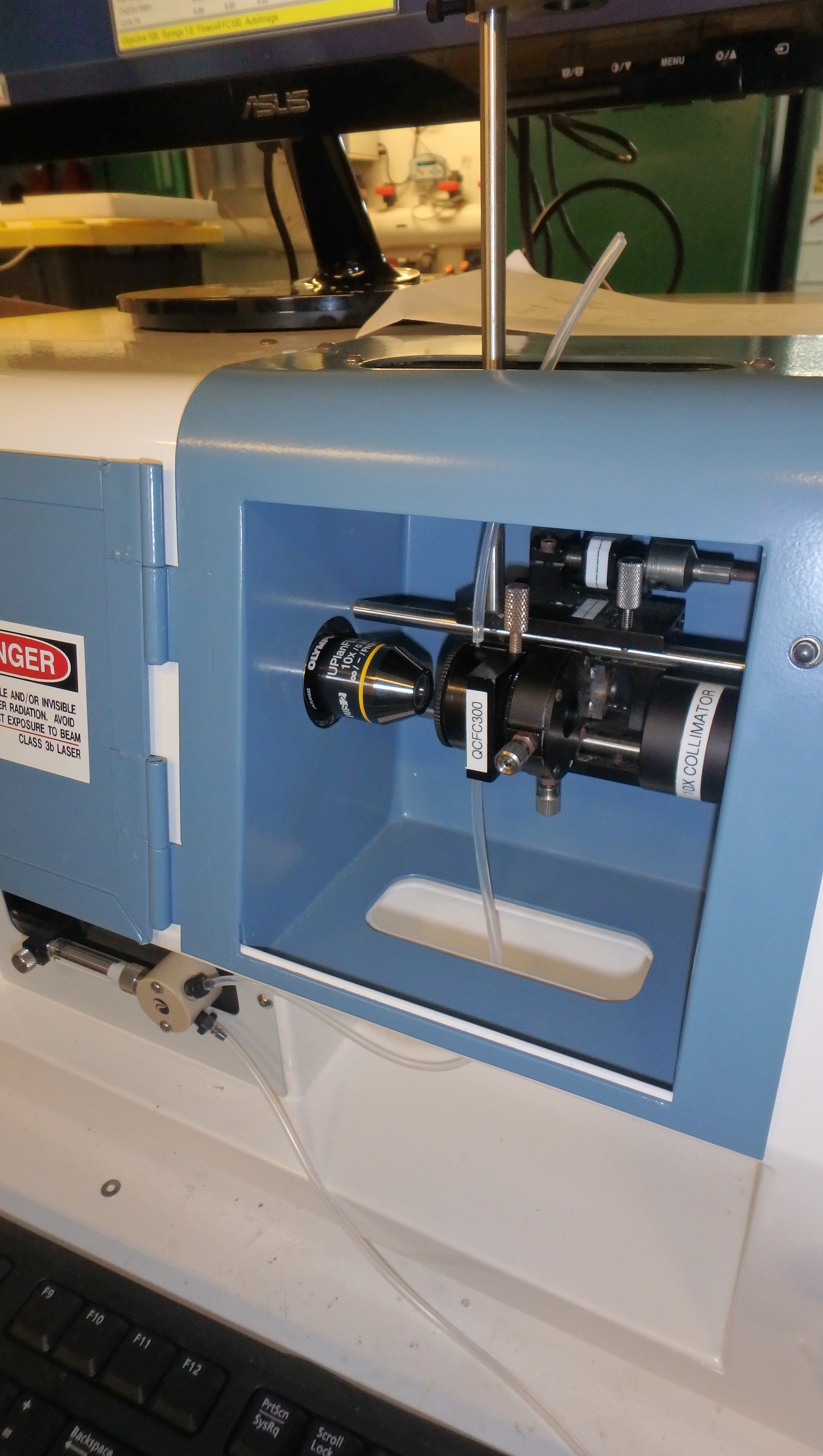 The flow cell is now secure and ready to hold water samples. Light passes through the flow cell from a light source on the right of the image. To the left of the flow cell, an objective lens magnifies the organisms that pass through the flow cam. Aboard the Nathaniel B. Palmer, docked in Punta Arenas, Chile.