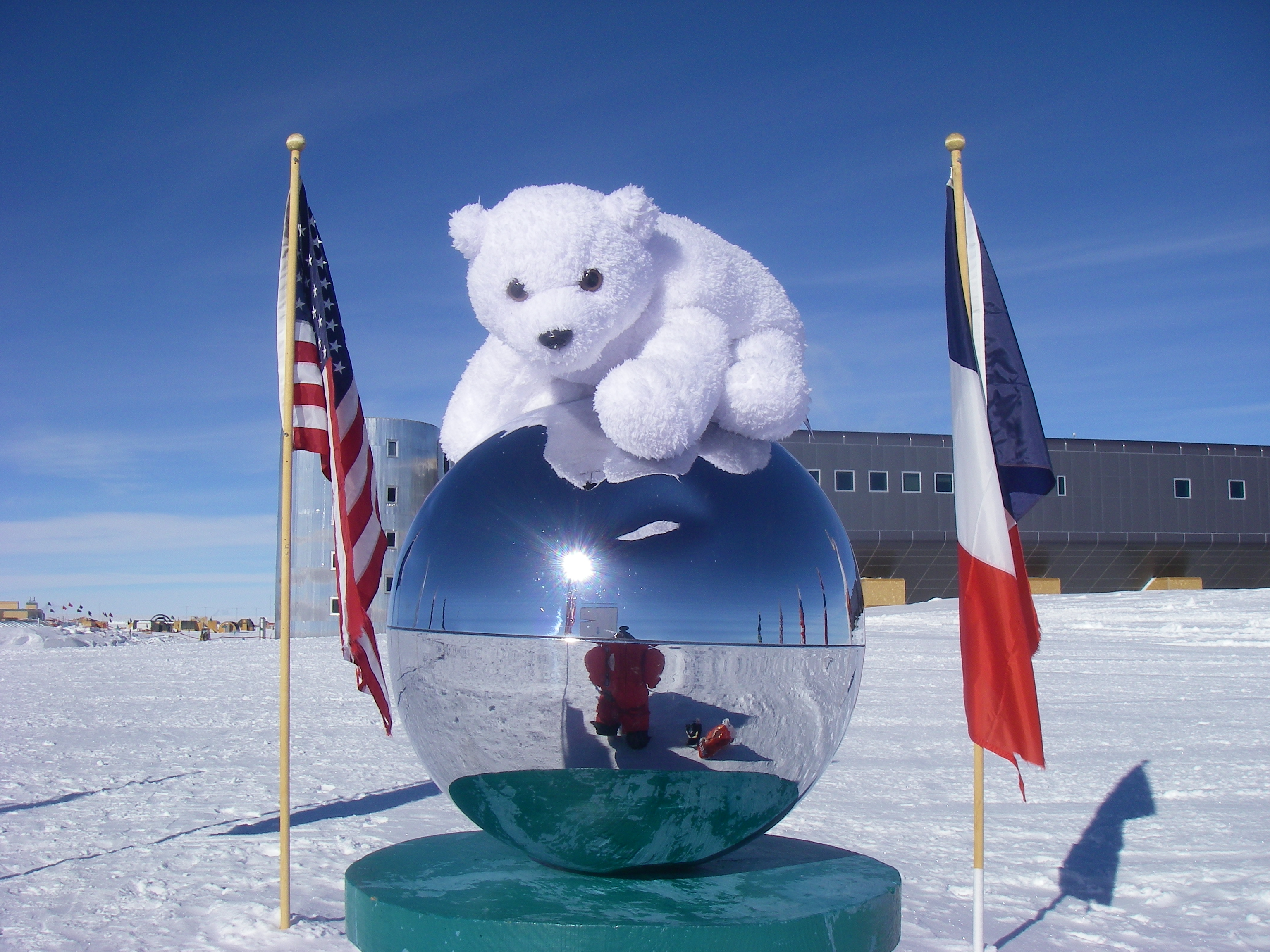 Elke Bergholz's travel group member, "Northie" on top of the glass ball of the Ceremonial Pole. The glass ball is surrounded with the flags of the 16 countries that originally signed the Antarctic Treaty. The flag of France and of the USA are in this photo. At the Ceremonial Pole outside the new elevated Amundsen-Scott South Pole Station, Antarctica.