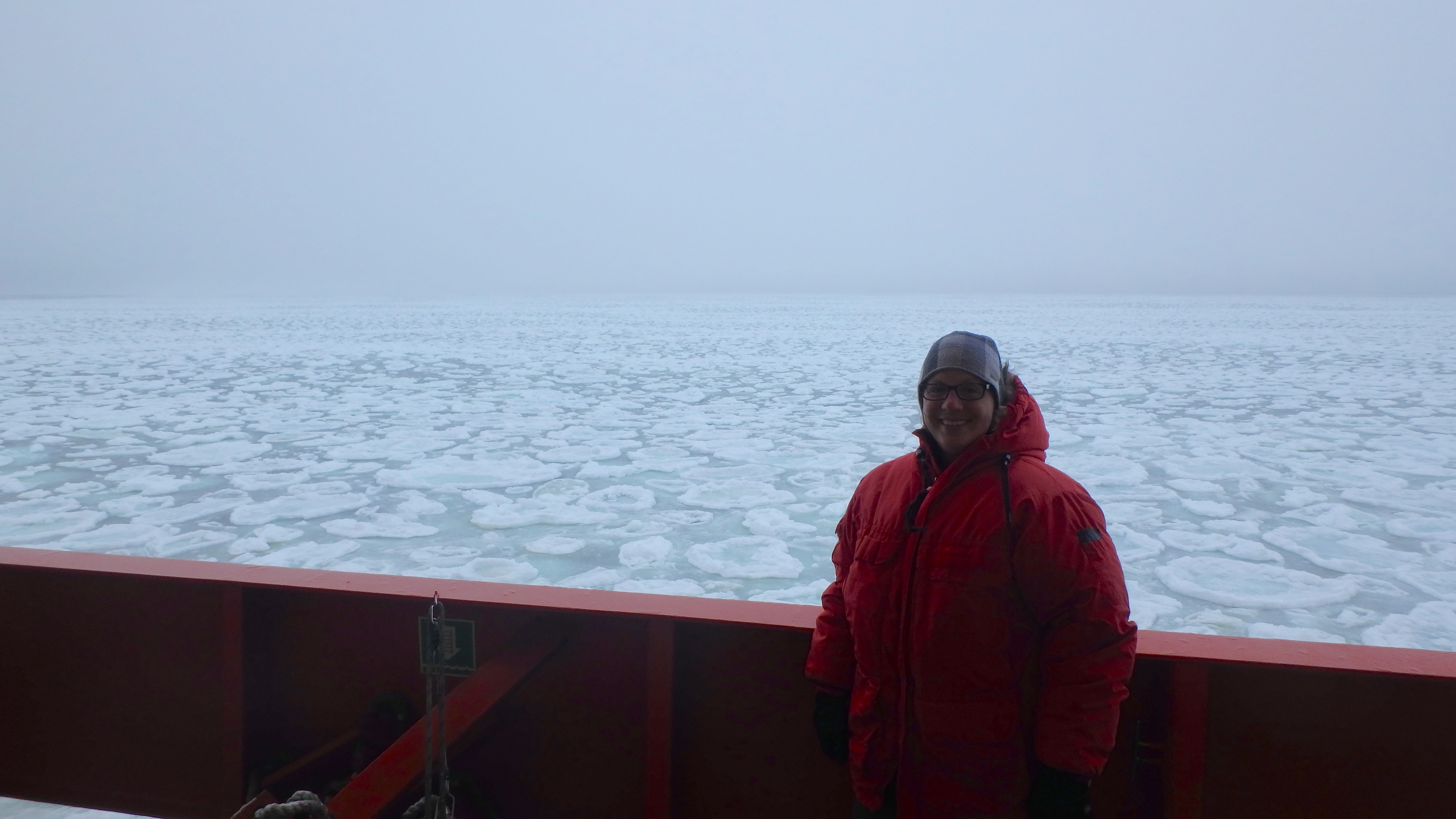 Cara Pekarcik stands on the 01 deck overlooking a sea of pancake ice. Aboard the Nathaniel B. Palmer.