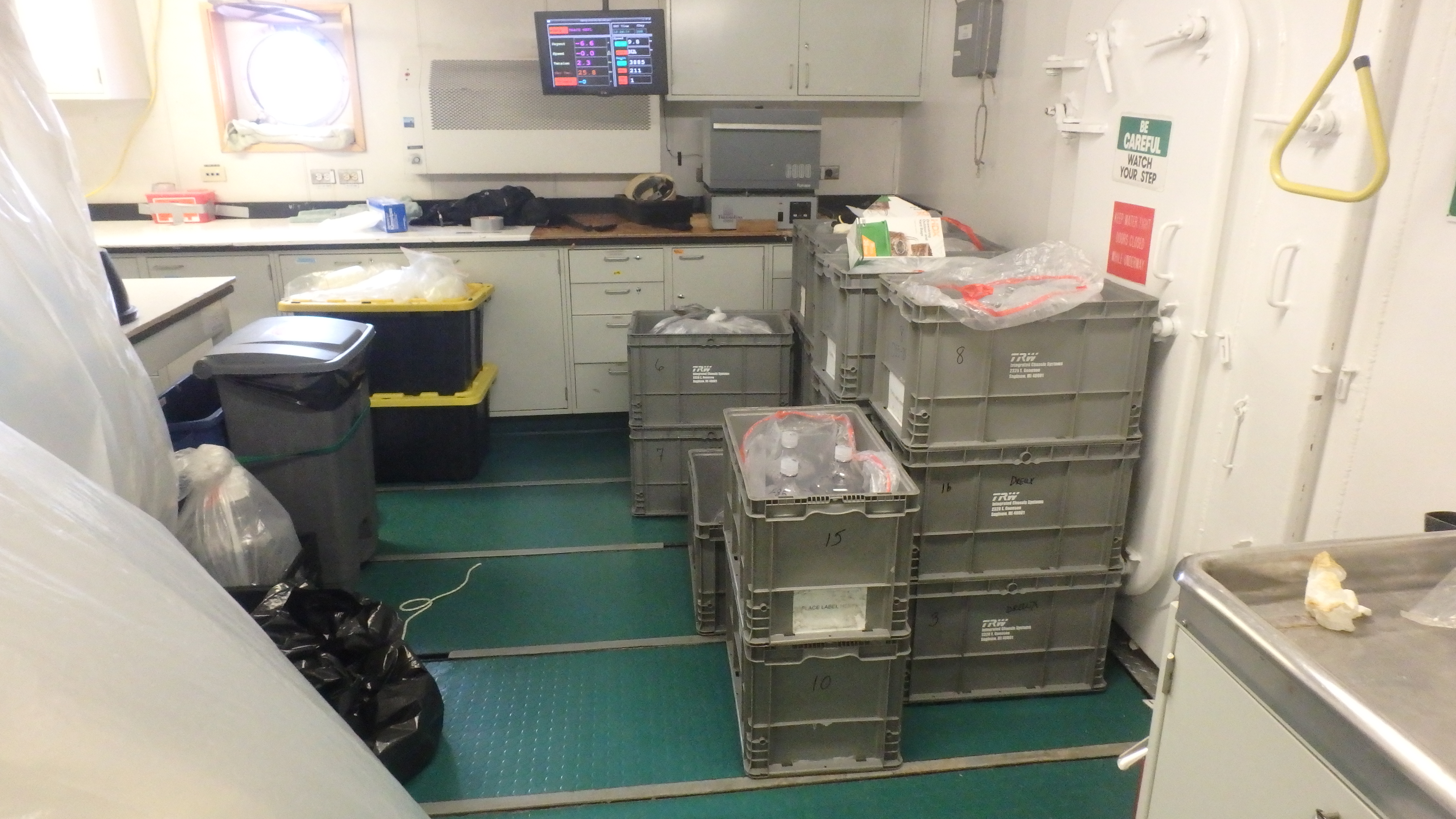 All of the gear that was initially brought to the Palmer must be re-packed and prepared for shipment back to the indvidual labs. The grey containers on the right hold all of the incubation bottles from the experiments. Aboard the Nathaniel B. Palmer in the Drake Passage.
