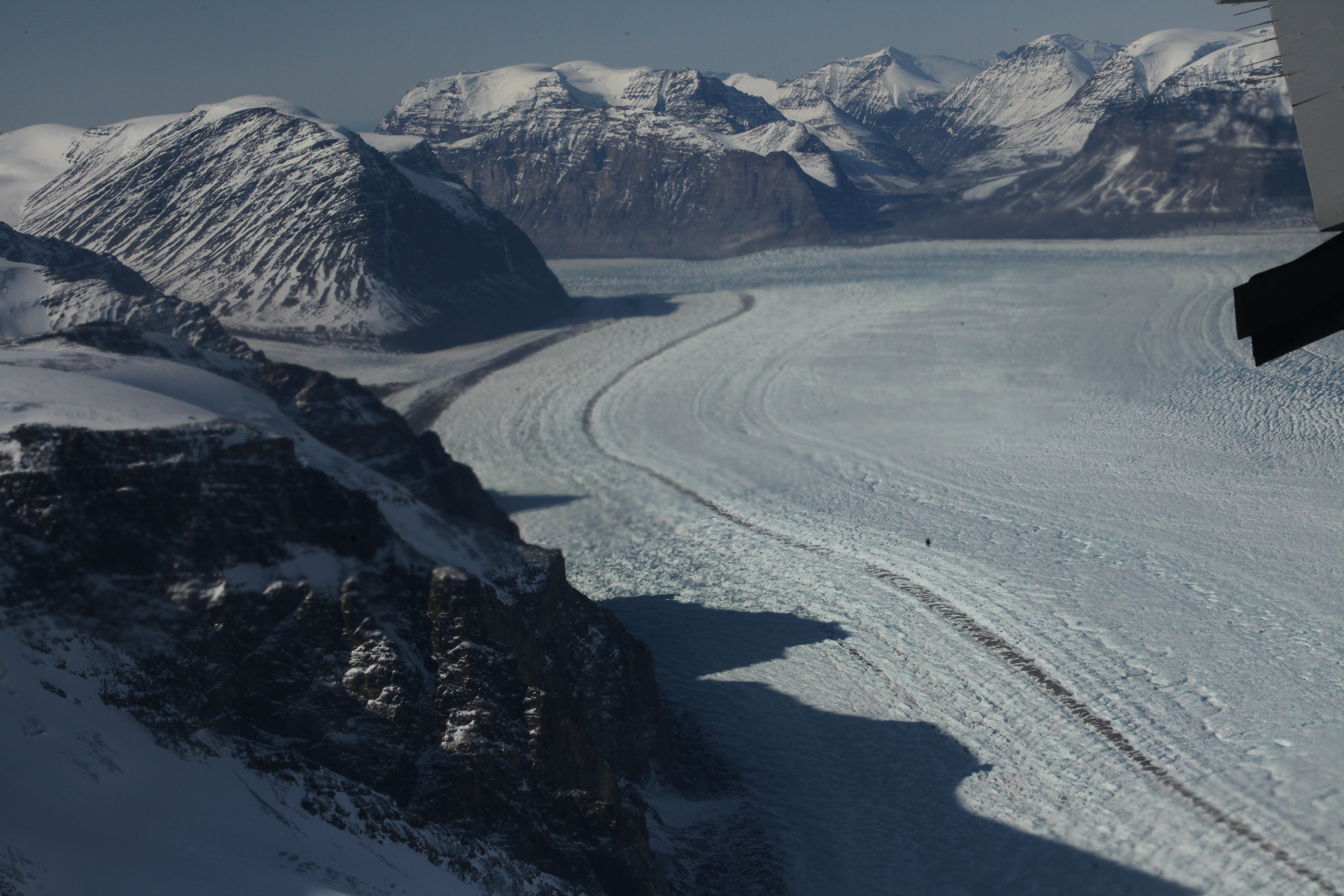 NASA's Operation IceBridge flies 1500 feet above a flowing glacier on the Greenland Ice Sheet during the scenic Southeast Coastal Mission. Aboard the WP-3D Orion over the Greenland Ice Sheet.